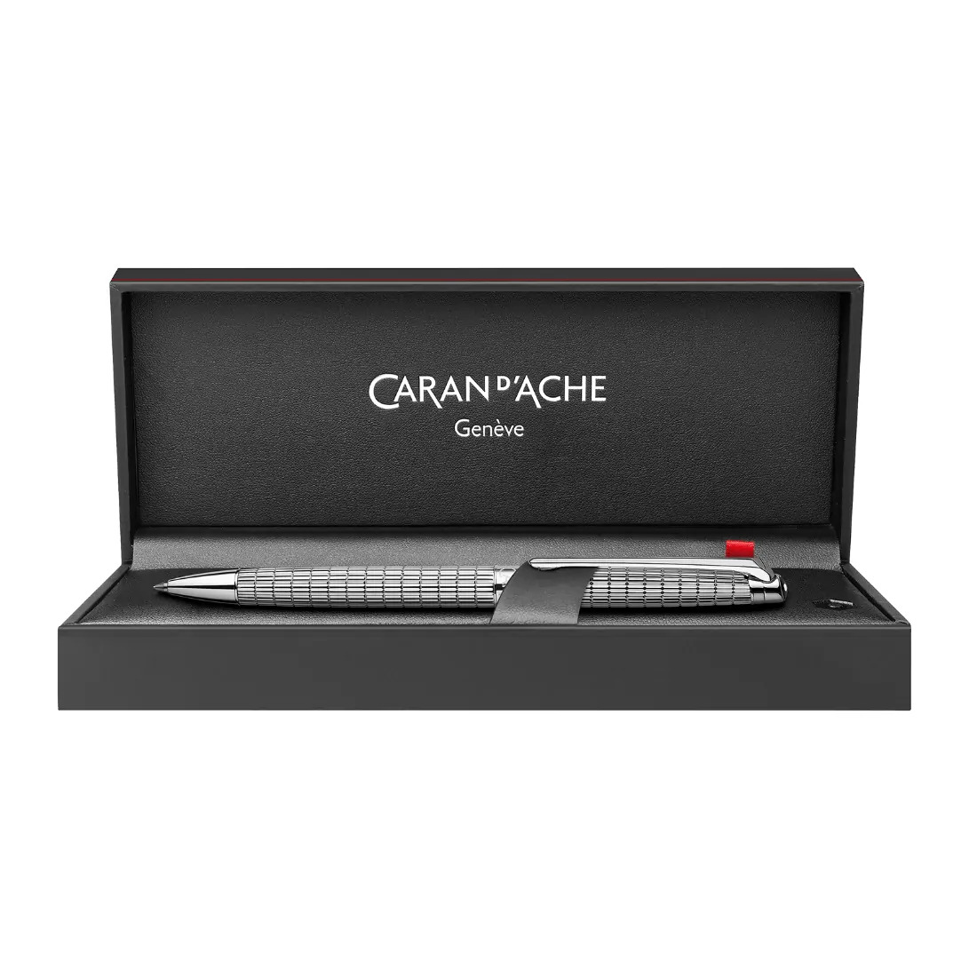 Cuerpo redondo recubierto de rodio y plata Fresa de diamante talla baguette grabado profundo Logotipo de Caran d'Ache y Swiss Made grabado en el anillo Rotativo de precisión mecanismo para una comodidad óptima del usuario Botón de tapa con identificación Caran d'Ache (hexágono lacado en negro) Clip y botón rodiados