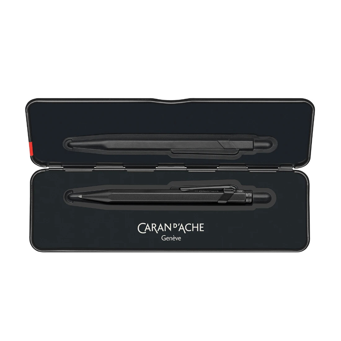 Slimpack estándar barnizado en negro con el logotipo de Caran d'Ache en el interior y el exterior Calce de silicona magnético Dimensiones: 20 cm x 6 cm x 2 cm Peso: 100 g (70 g sin producto)