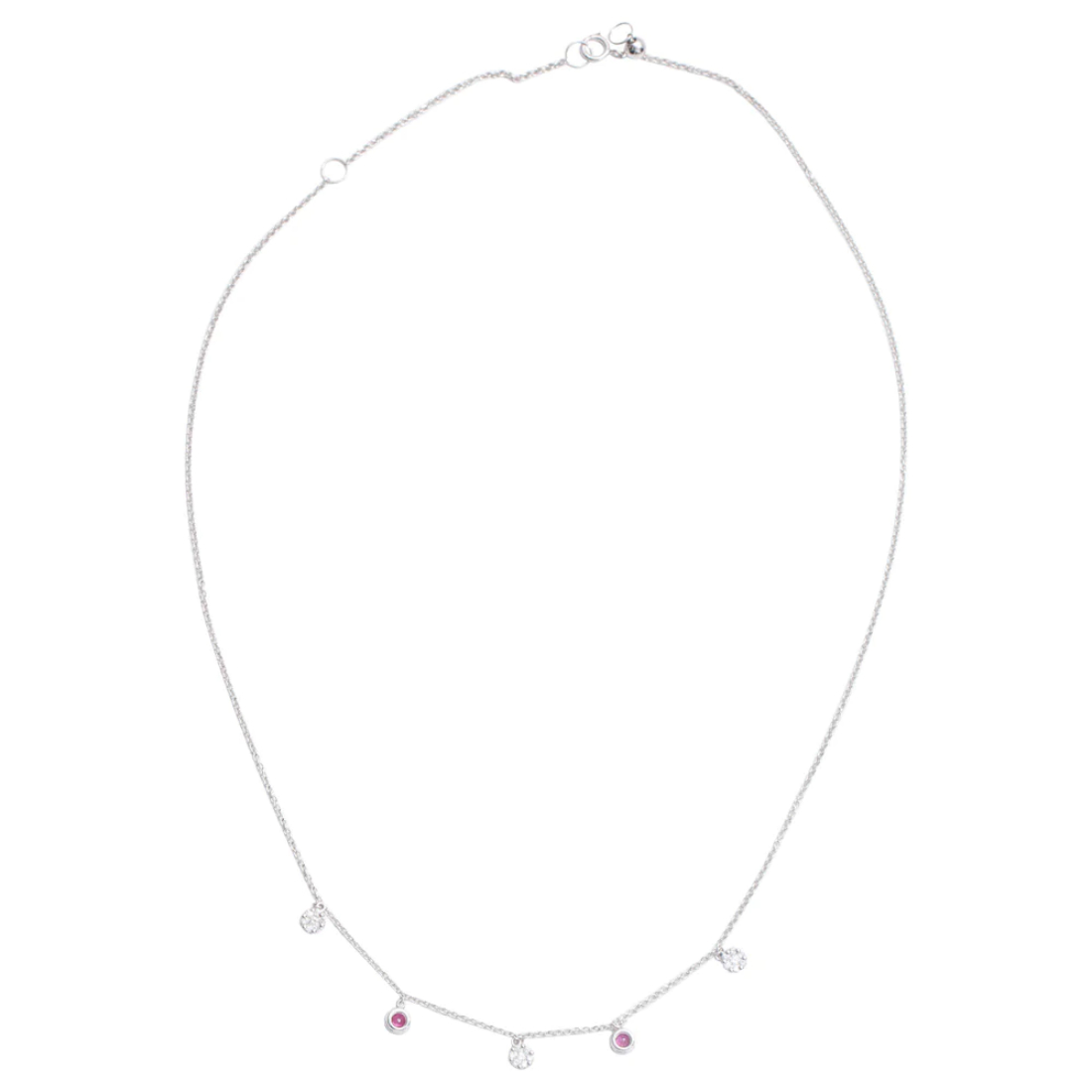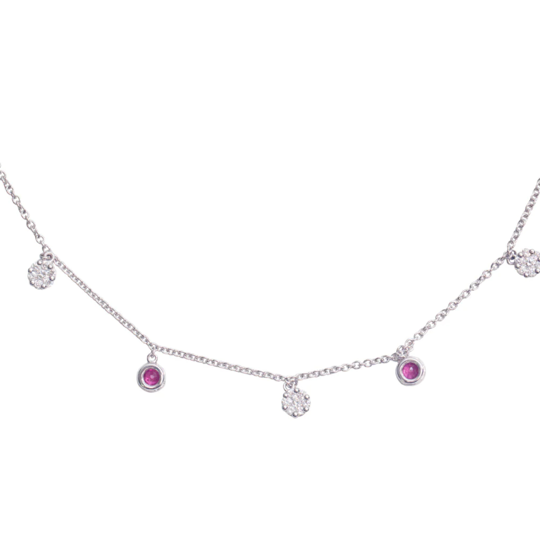 Esta gargantilla es la pieza perfecta para agregar un toque de brillo y sofisticación en el día a día; es un modelo moderno y atemporal, con un toque de color ofrecido por los rubíes corte brillante, y un toque de brillo sutil de los diamantes. Esta gargantilla podría ser un obsequio ideal hacia un ser querido, en cualquier ocasión.