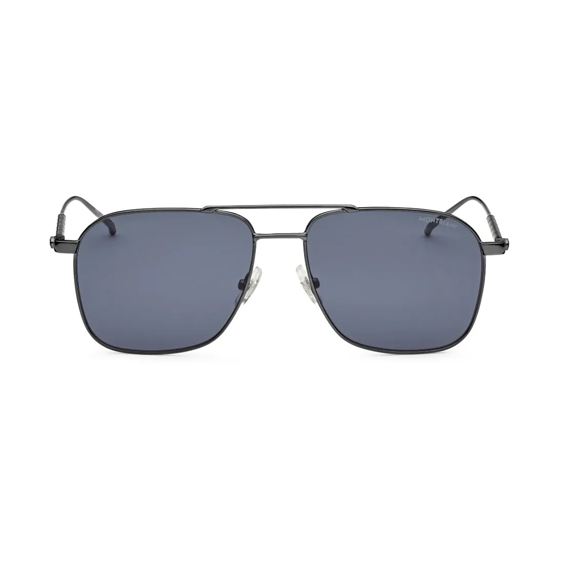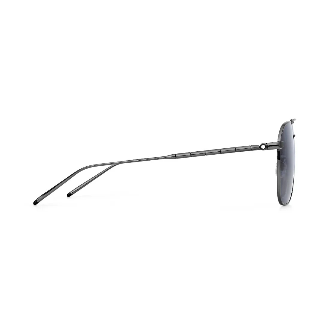 Estas gafas de sol de estilo rectangular cuentan con una montura metálica ruteniada y lentes azules. El emblema de pico nevado de Montblanc aparece representado en la patilla de construcción multicilíndrica, con detalles de esmalte negro en los terminales y el logotipo Montblanc se encuentra grabado a láser en la lente izquierda.