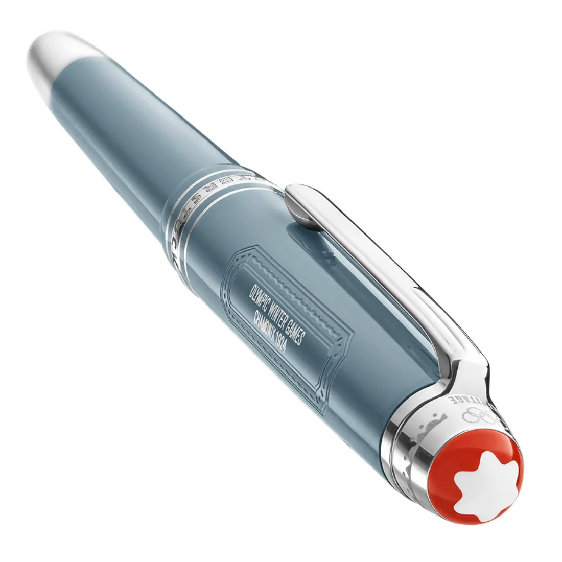 Preciosa resina con un tono gris azulado El capuchón se encuentra grabado con las palabras "Olympic Games Chamonix 1924" dentro de un marco inspirado en la portada del informe oficial de los Juegos. El anillo del capuchón del aniversario presenta tanto "1924" como "2024", simbolizando así la importancia de ambos años. Coronando la edición encontramos el emblema Montblanc en la parte superior del capuchón en preciosa resina color coral, color distintivo de Montblanc.