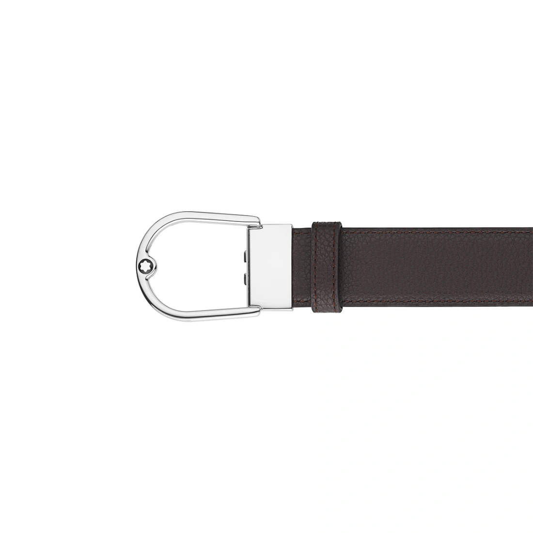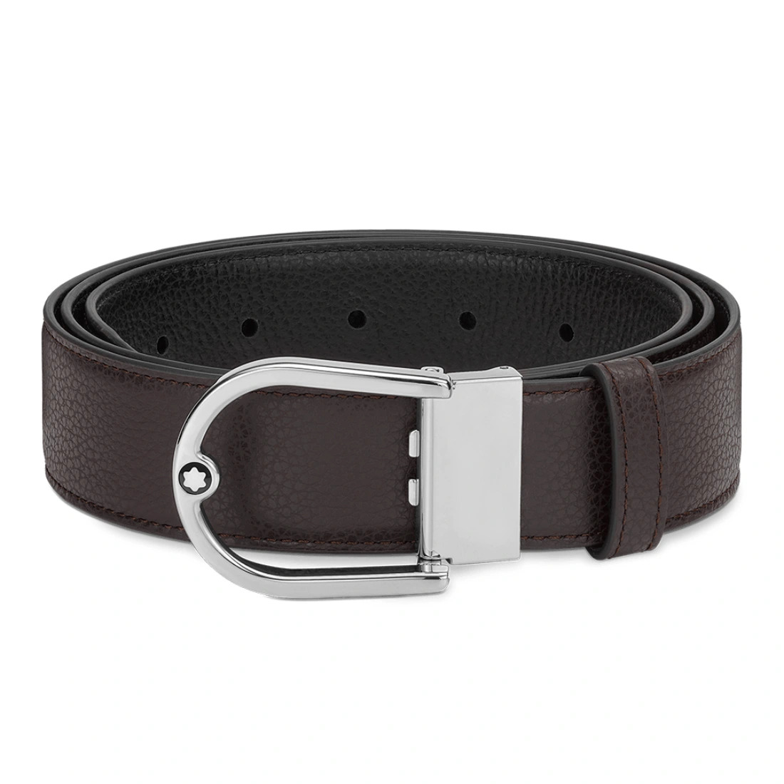 Este cinturón reversible, por un lado de color ébano y por el otro negro, duplica tus opciones de estilo y está elaborado con una lujosa piel graneada. La hebilla en forma de herradura paladiada aporta un toque atemporal a este versátil cinturón, que se completa con el emblema Montblanc.