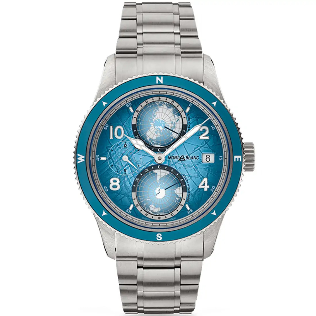 Esfera en Sfumato azul hielo con motivo de glaciar y números árabes e índices luminiscentes blancos rodiados