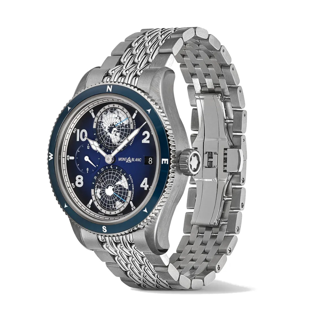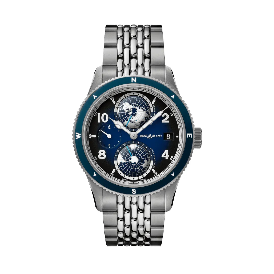 La línea Montblanc 1858 se inspira en los legendarios relojes Minerva profesionales de las décadas de 1920 y 1930, diseñados para uso militar y exploración. La línea Montblanc 1858 reinterpreta estos relojes legendarios y expresa el espíritu del senderismo alpino, encarnando la tendencia moderna de volver a la naturaleza. El Montblanc 1858 Geosphere está dedicado al desafío global de montañismo "Siete Cumbres", el "Santo Grial" del senderismo de montaña. La caja de titanio de 42 mm presenta detalles azules contrastantes con elementos de color hielo, que se inspiran en los colores de los glaciares. El reloj está equipado con una complicación interna de hora mundial desarrollada por los relojeros de Montblanc en Villeret: dos globos abovedados que giran en direcciones opuestas completando una evolución completa en 24 horas. Ambos están rodeados por una escala con los 24 husos horarios, junto con una indicación día/noche con colores en contraste que permite apreciar mejor los distintos husos horarios, gracias también al SuperLumiNova® aplicado a los continentes, que garantiza una mayor visibilidad y una mejor rendimiento en la oscuridad. El reloj se completa con un nuevo brazalete técnico bimetálico vintage en titanio satinado mate y acero inoxidable pulido.