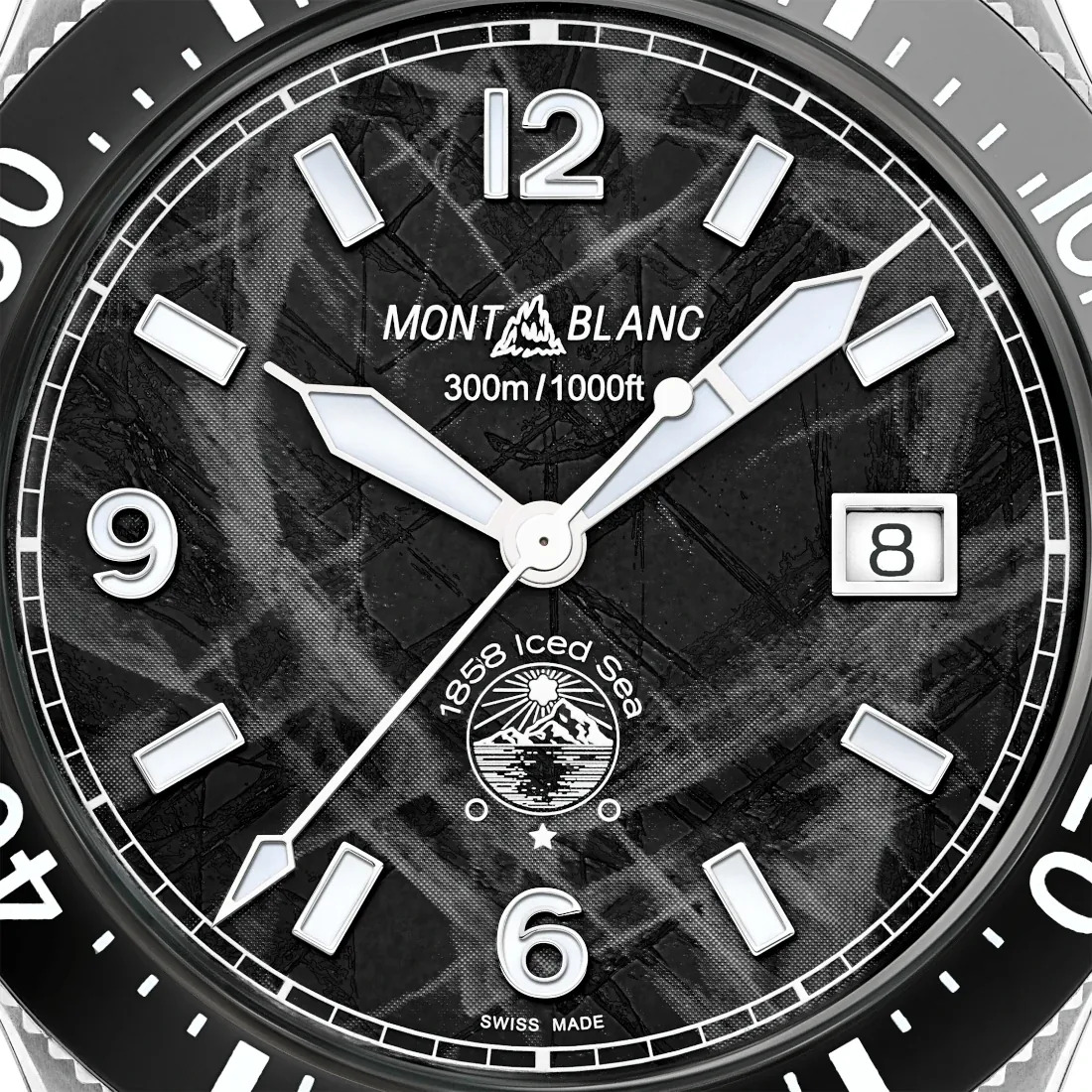 El Montblanc 1858 Iced Sea Automatic Date, el primer reloj de buceo deportivo de Montblanc, se caracteriza por el motivo de glaciar de la esfera, gracias al cual nos adentramos en las profundidades de esta masa de hielo. Esta esfera negra con motivo de glaciar se inspira en el Mer de Glace (mar de Hielo, en español), el principal glaciar del macizo del Mont Blanc. La textura se ha logrado mediante una técnica ancestral prácticamente olvidada que se denomina gratté-boisé. Este reloj presenta un bisel unidireccional de cerámica bicolor, una tapa trasera grabada y una pulsera de acero biselada intercambiable con un ajuste preciso. El reloj cumple la norma ISO 6425 para los relojes de buceo y es resistente al agua hasta 300 metros.