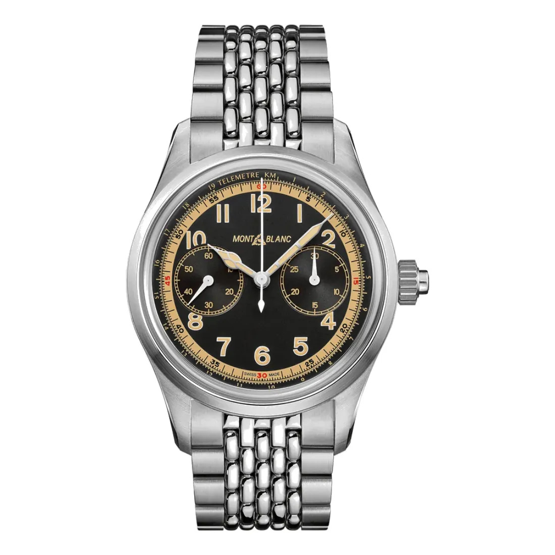 MATERIAL DE LA CAJA: Acero ESFERA: Esfera negra con números árabes beige luminiscentes, escala telemétrica BISEL: Fijo CRISTAL ANTIRRAYADO: No FORMA DEL CRISTAL: Abombado DESCRIPCIÓN DEL CRISTAL: Cristal abombado con revestimiento antirreflejante TIPO DE CRISTAL: Zafiro CORONA: Acanalada, de acero, con emblema Montblanc en relieve RESISTENTE AL AGUA: 10 bar (100 m) bar MATERIAL DE LA PARTE TRASERA DE LA CAJA: Caja de acero DIÁMETRO DE LA CAJA: 42 mm MATERIAL DE LA LUNETA: Acero