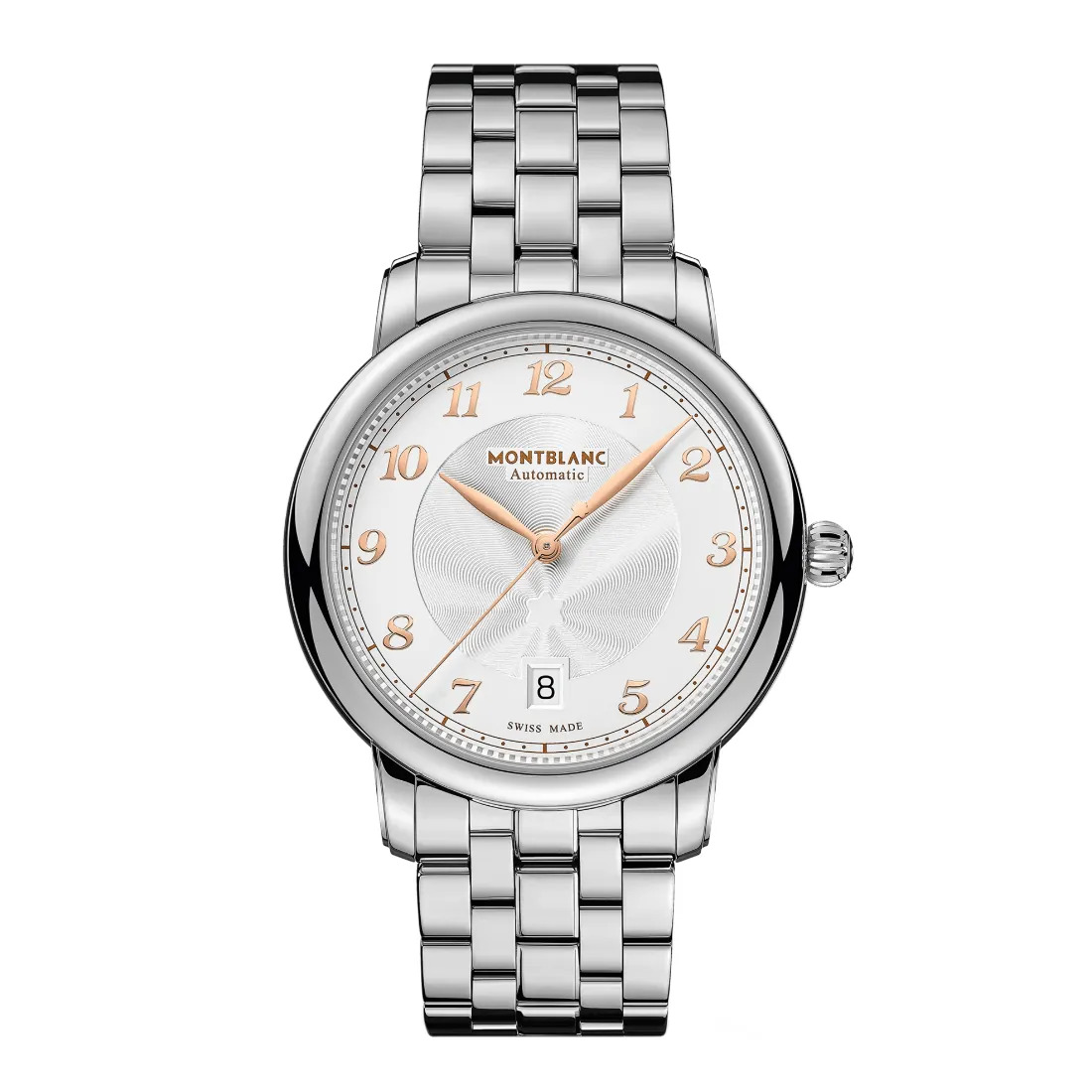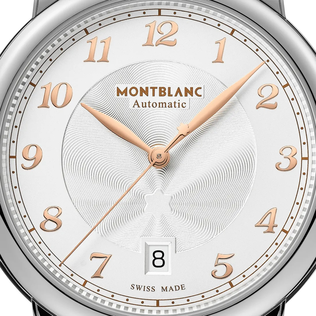 La colección Montblanc Star Legacy se inspira en el legado de Minerva y en los relojes de bolsillo que fabricó la empresa a finales del siglo XIX y comienzos del siglo XX. Fiel a los códigos de diseño de la línea de productos, Montblanc Star Legacy Automatic Date tiene una refinada esfera plateada-blanca con el motivo guilloché de estrella en expansión Montblanc, números árabes, agujas Feuille, decoración guilloché "filet sauté" y una exclusiva minutería de estilo "ferrocarril". Este reloj es animado por el calibre automático MB 24.17 con agujas centrales para las horas, los minutos y el segundero, así como indicación de la fecha a las 6. Presenta una caja de acero de 39 mm y una pulsera de acero.