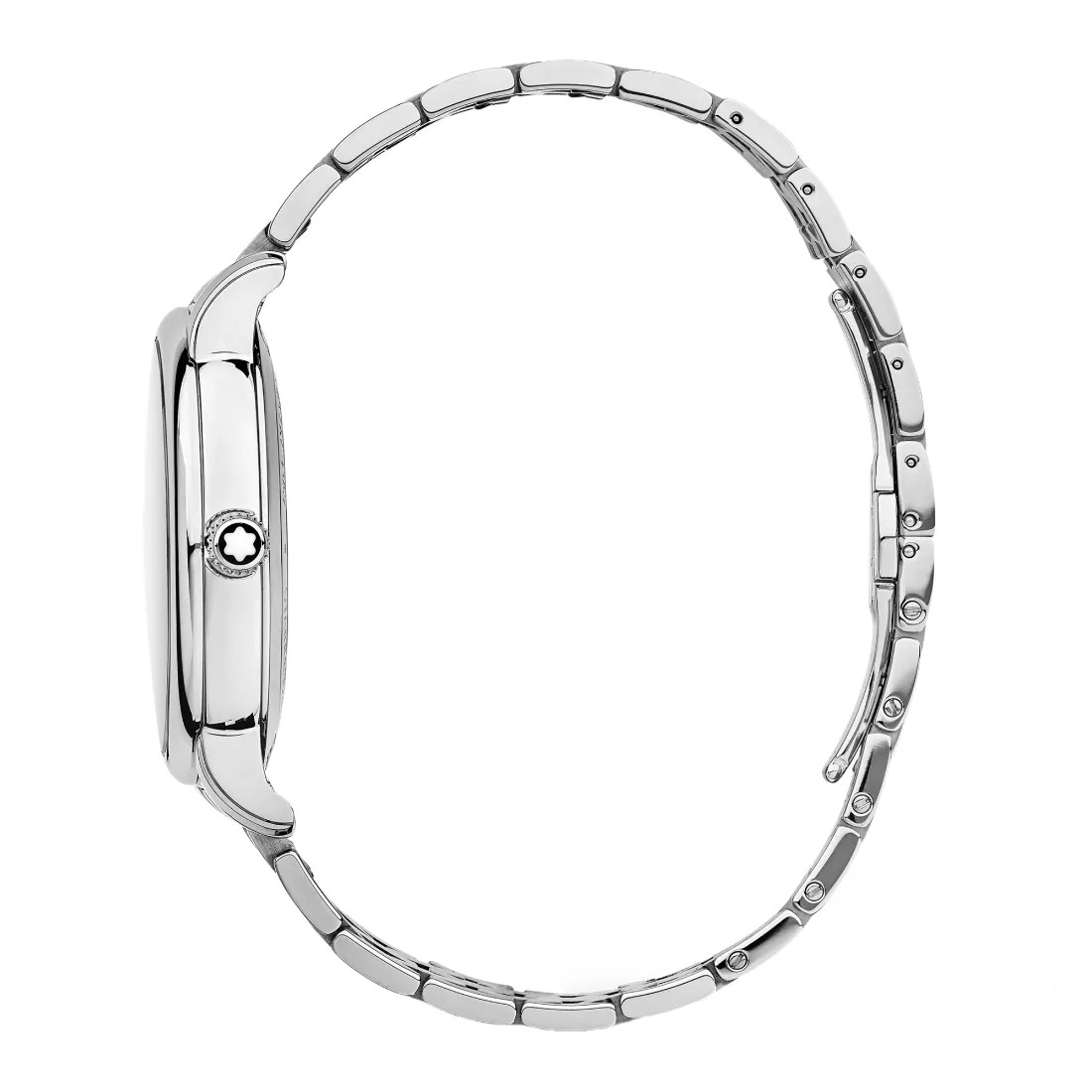 Caja MATERIAL DE LA CAJA: Acero ESFERA: Esfera plateada-blanca con números árabes chapados en oro rosa BISEL: Fijo CRISTAL ANTIRRAYADO: Sí FORMA DEL CRISTAL: Abombado DESCRIPCIÓN DEL CRISTAL: Tapa trasera de cristal de zafiro TIPO DE CRISTAL: Zafiro CORONA: Acero con emblema Montblanc RESISTENTE AL AGUA: 5 bar (50 m) bar MATERIAL DE LA PARTE TRASERA DE LA CAJA: Caja de acero DIÁMETRO DE LA CAJA: 39 mm MATERIAL DE LA LUNETA: Acero