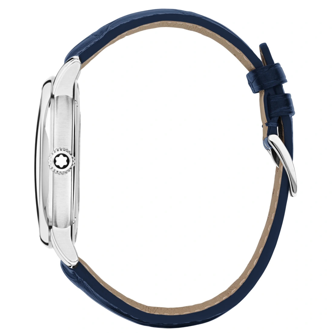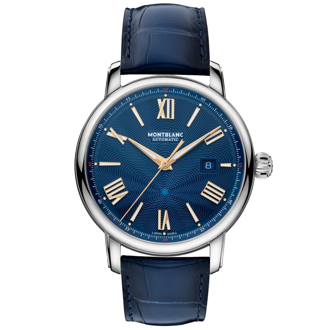 Esfera azul con realce azul números romanos e índices luminiscentes blancos chapados en oro rosa