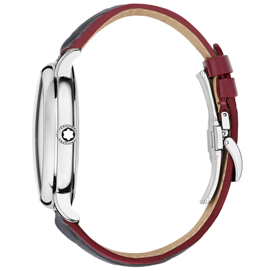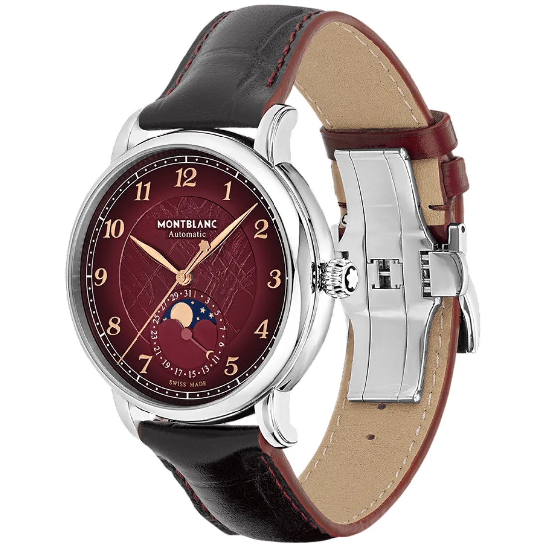 Motivo de glaciar color burdeos con un efecto sfumato a su alrededor, un motivo "filet sauté", agujas y números chapados en oro rosa, y un emblema Montblanc en el contrapeso del segundero
