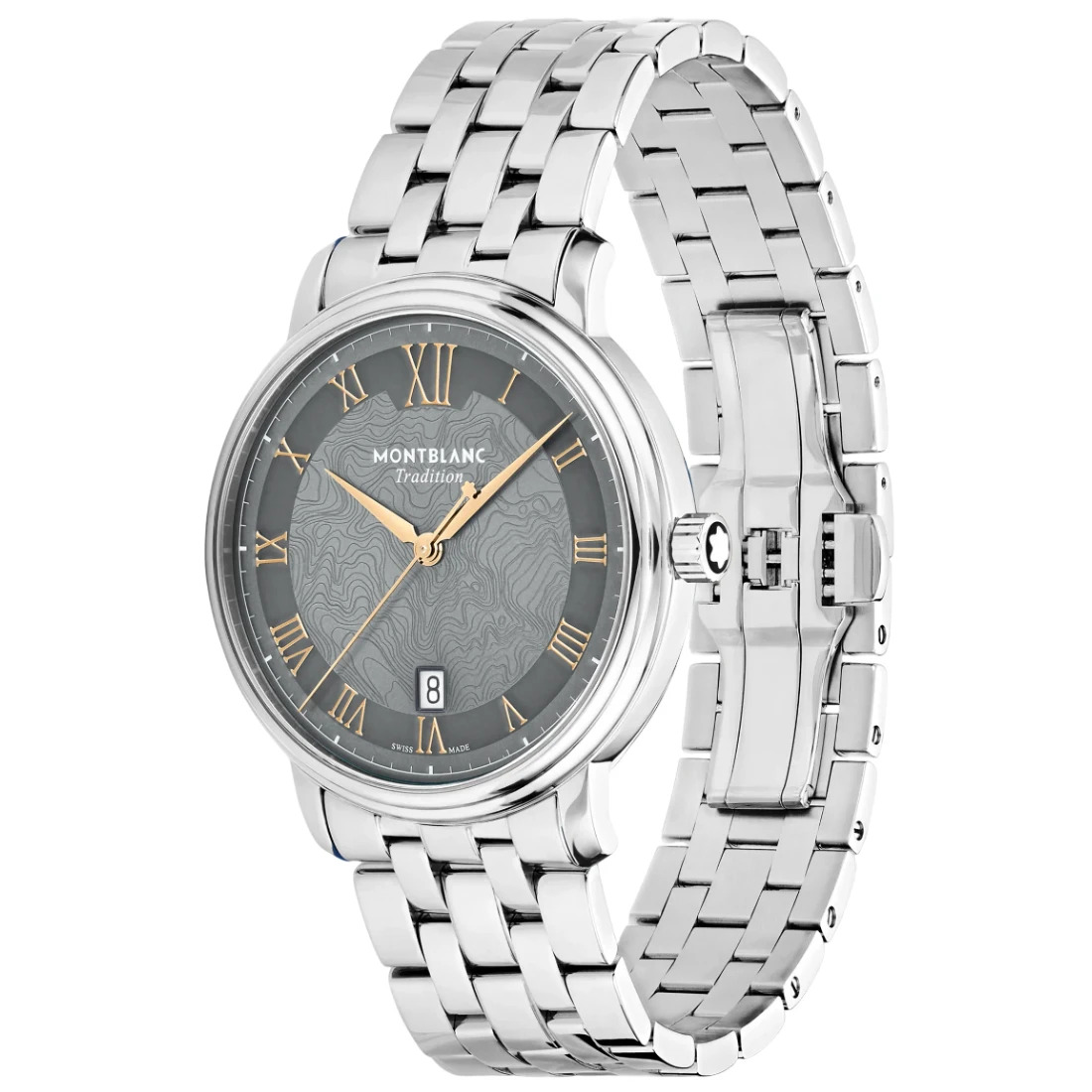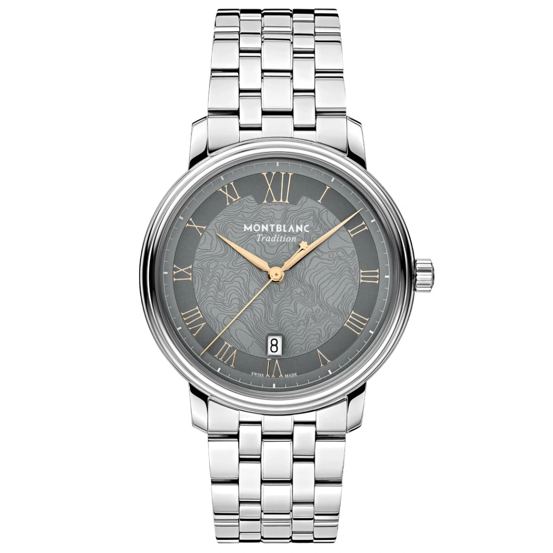 Esfera Esfera gris que representa la topografía del Mont Blanc con números romanos en color oro rosa y un prominente XII