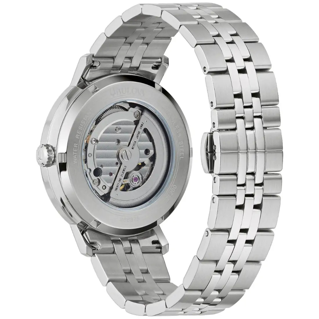 Reloj Bulova para caballero Colección Aerojet. Movimiento mecánico de cuerda automática de 3 manecillas, subcarátula indicador día y noche y fechador. Reserva de marcha de 42 horas. Caja y brazalete realizados en acero inoxidable, broche desplegable de doble pulsador. Carátula café con efectos de rayo de sol, indicadores y manecillas luminiscentes en plateado, logo vintage Aerojet. Tapa transparente. Cristal mineral.