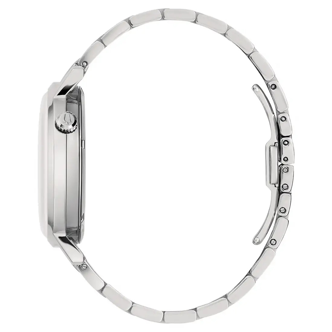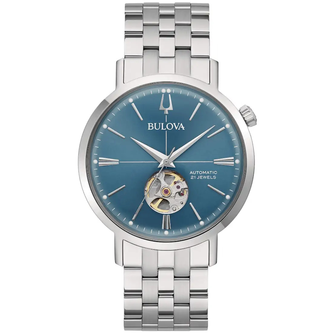 Reloj Bulova Aerojet para caballero Movimiento mecánico de cuerda automática de 3 manecillas, reserva de marcha de 40 horas Caja realizada en acero inoxidable. Carátula azul con apertura, indicadores y manecillas en plateado. Corona colocada a las dos hrs., tapa transparente atornillable. Cristal mineral.