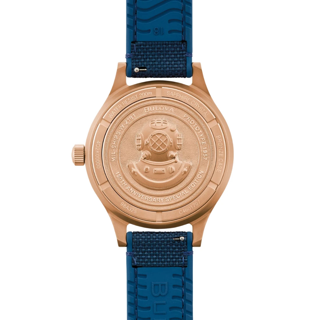 En honor a la legendaria historia de Bulova con las fuerzas armadas y basado en un prototipo poco común de 1957 desarrollado para la Marina de los EE. UU., la edición especial MIL-SHIPS Bronze celebra el 150.° aniversario de Bulova y su legado de innovación y excelente artesanía. Este reloj recientemente rediseñado presenta un diseño elevado con una caja con acabado arenado hecha de bronce CuSn8, un material brillante con un tono oro rosa que recuerda a los cascos de buceo de cobre del siglo XIX.