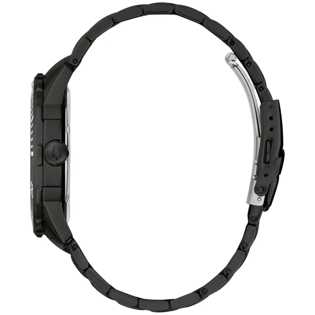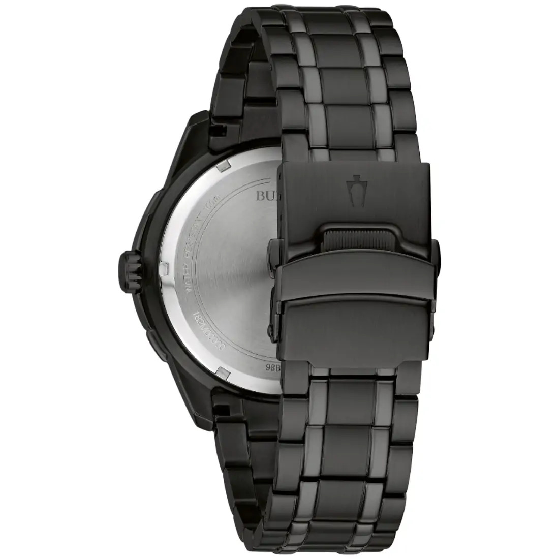 Este reloj Bulova se muestra en una caja y pulsera de acero inoxidable con baño de iones negro. Cuenta con una esfera negra con ventana de fecha y es resistente al agua hasta 100 metros.