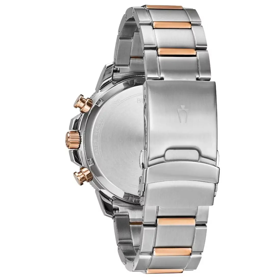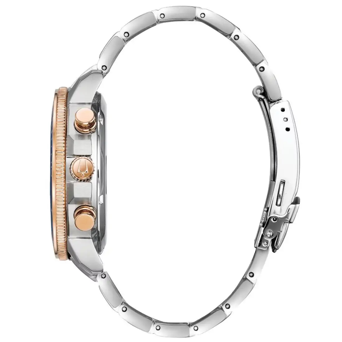 Reloj Bulova Marine Star para caballero. Movimiento cronógrafo de cuarzo de 6 manecillas. Caja y brazalete realizados en acero inoxidable dos tonos acero/oro rosa broche desplegable de doble pulsador. Bisel giratorio con inserto de vidrio azul. Carátula azul con indicadores y manecillas, luminiscentes en oro rosa. Cristal mineral abombado, Tapa atornillable.