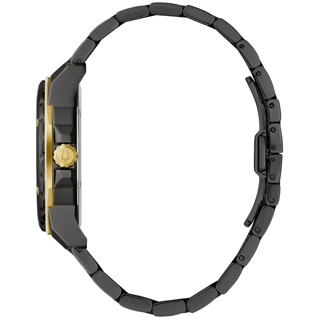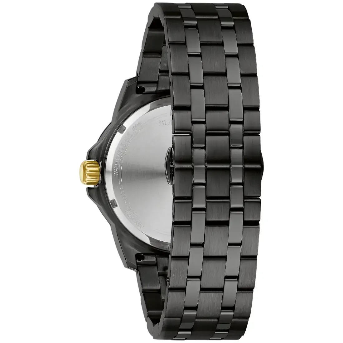 Reloj Bulova Colección Marine Star para caballero.8 diamantes montados a mano de forma individual en carátula como indicadores. Movimiento de cuarzo de 3 manecillas y fechador. Caja y brazalete realizados en acero inoxidable acabado PVD negro, broche desplegable de doble pulsador. Bisel superior y corona en dorado. Carátula negra, indicadores y manecillas luminiscentes en dorado. Cristal mineral.