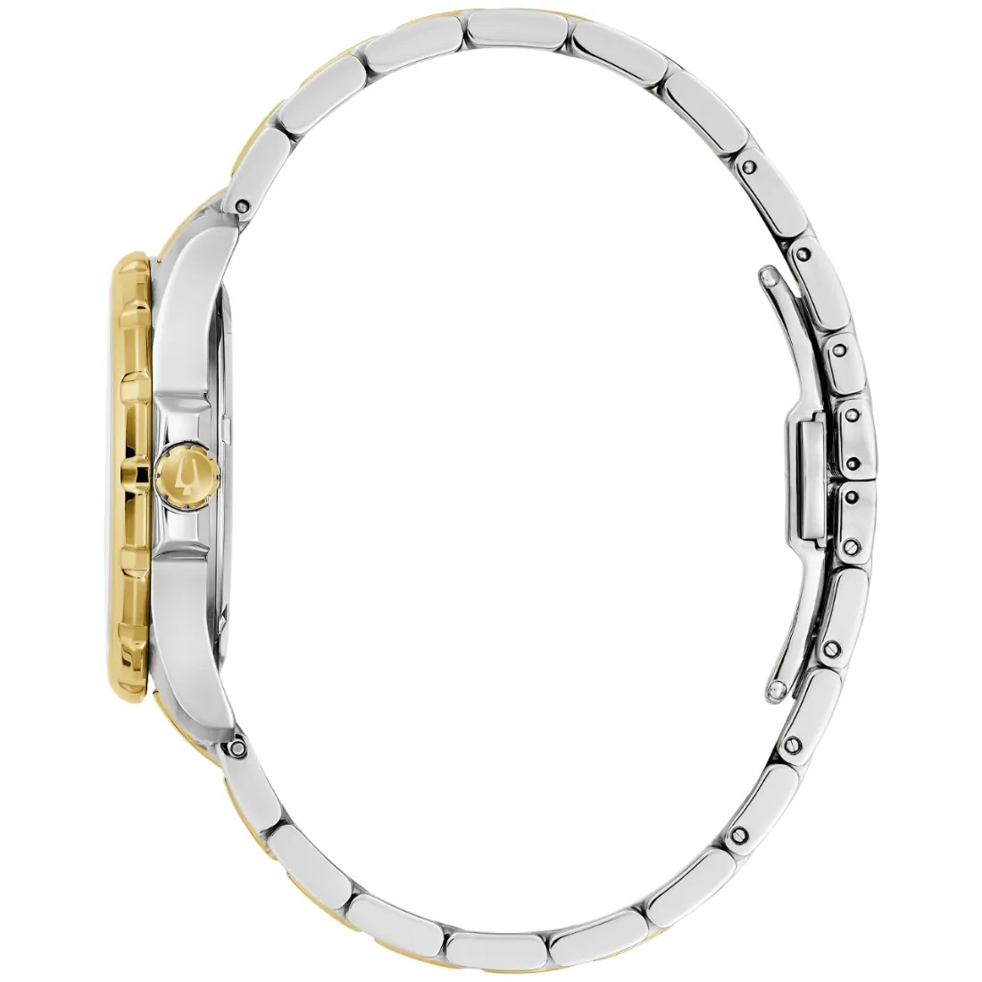 Reloj Bulova colección Marine Star para Dama. 8 diamantes montados a mano de forma individual como indicadores. Movimiento de cuarzo de 3 manecillas. Caja y brazalete realizados en acero inoxidable dos tonos acero/dorado, broche desplegable de doble pulsador. Bisel superior en dorado. Carátula en Madre Perla blanca, indicadores y manecillas luminiscentes en dorado. Cristal de zafiro.