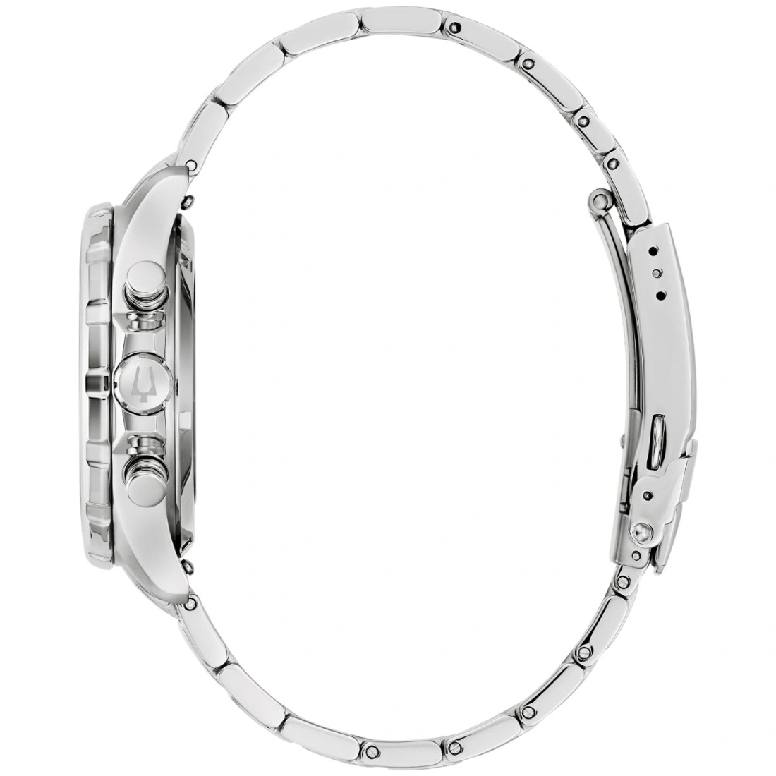 Reloj Bulova colección Marine Star series B para caballero. Movimiento cronógrafo de cuarzo de 6 manecillas y 3 subcarátulas. Caja 41 mm y brazaletes hechos de acero inoxidable, broche desplegable de pulsador. Carátula azul océano con manecillas y marcadores aplicados en color plata con Super-Luminova y fechador.