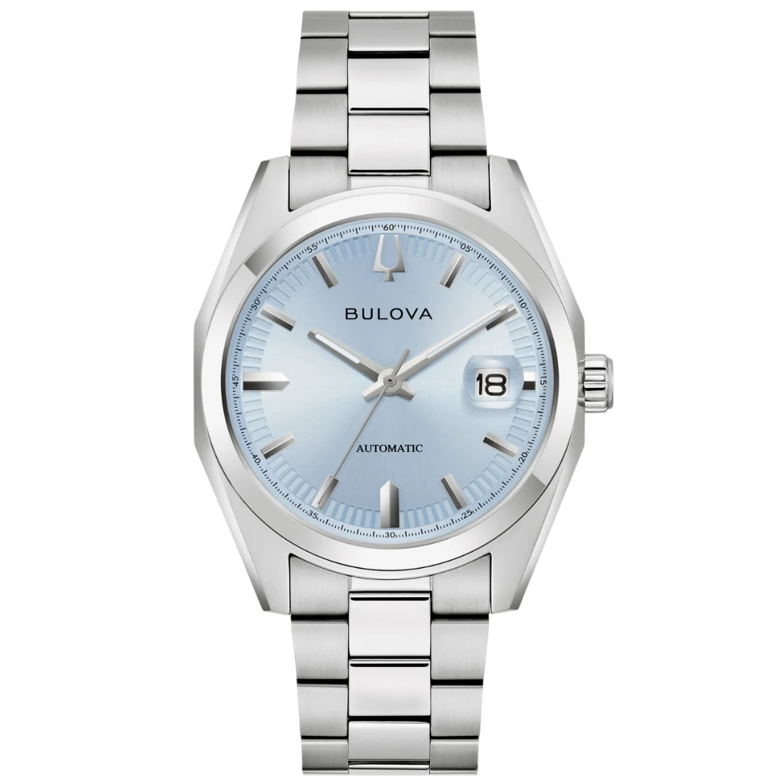 Reloj Bulova para Caballero, colección Surveyor. Movimiento mecánico de cuerda automática de 3 manecillas y fechador en posición de las 3Hrs, con gota de aumento. 42 horas de reserva de marcha. Caja y brazalete realizados en acero inoxidable, broche desplegable de doble pulsador. Carátula azul claro con efectos de rayo de sol, indicadores y manecillas luminiscentes en plateado. Cristal de zafiro. Tapa transparente