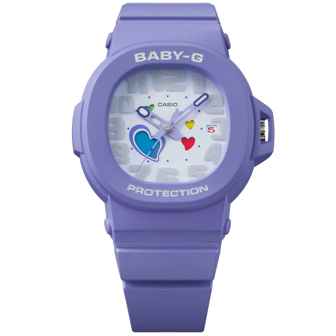 Tamaño de la caja (largo × ancho × alto): 46.6 × 42.1 × 11.4 mm Material de la caja/bisel: Resina Peso: 34 g Correa de resina Resistente a impactos Resistencia al agua de 100 m Fuente de alimentación: pila
