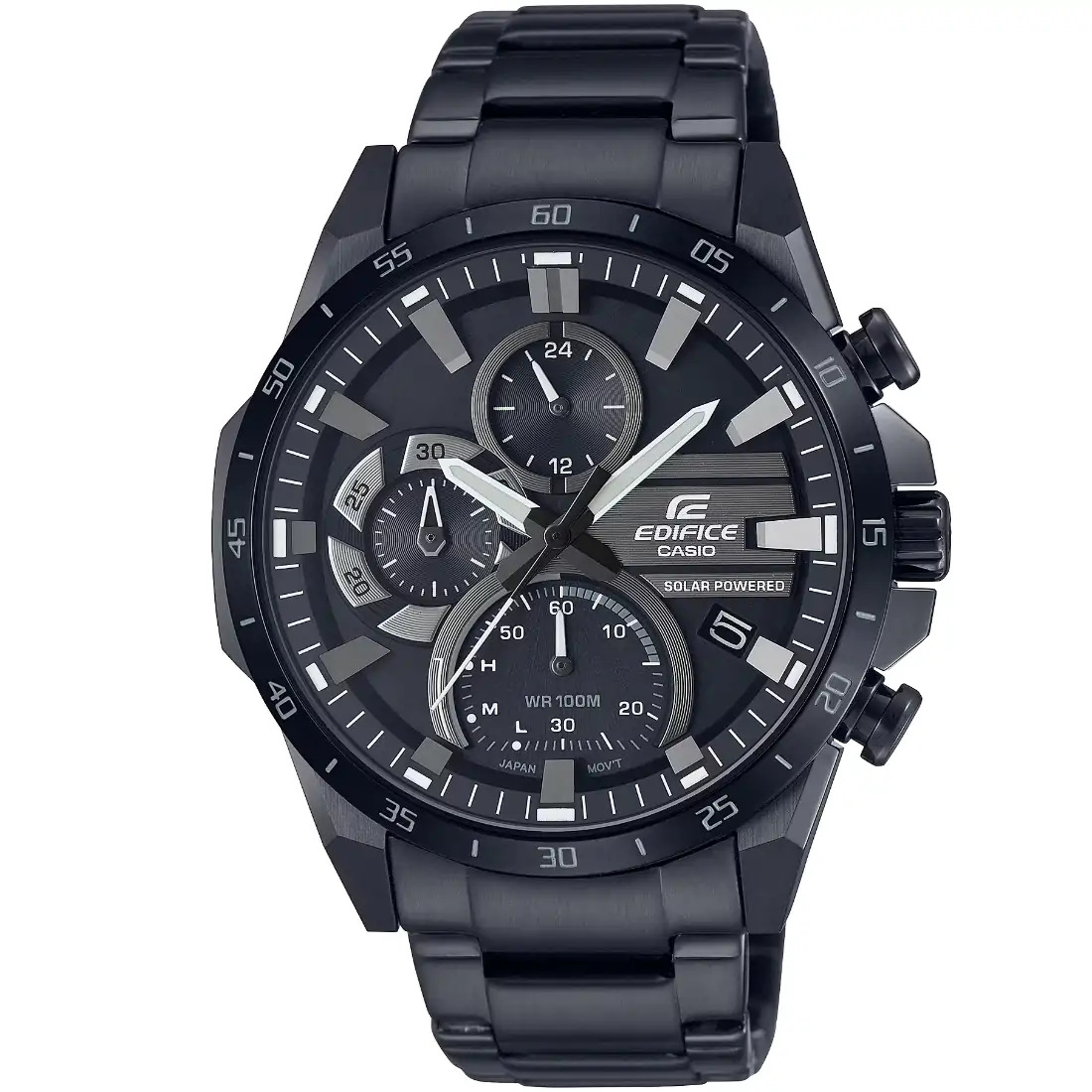Tamaño de la caja (L× W× H): 49.5 × 45.5 × 12.5 mm Material de la caja/bisel: Acero inoxidable Peso: 132 g Correa de acero inoxidable Broche de una pulsación y triple pliegue Resistente a impactos Resistencia al agua de 100 m Fuente de alimentación: Funcionamiento a energía solar