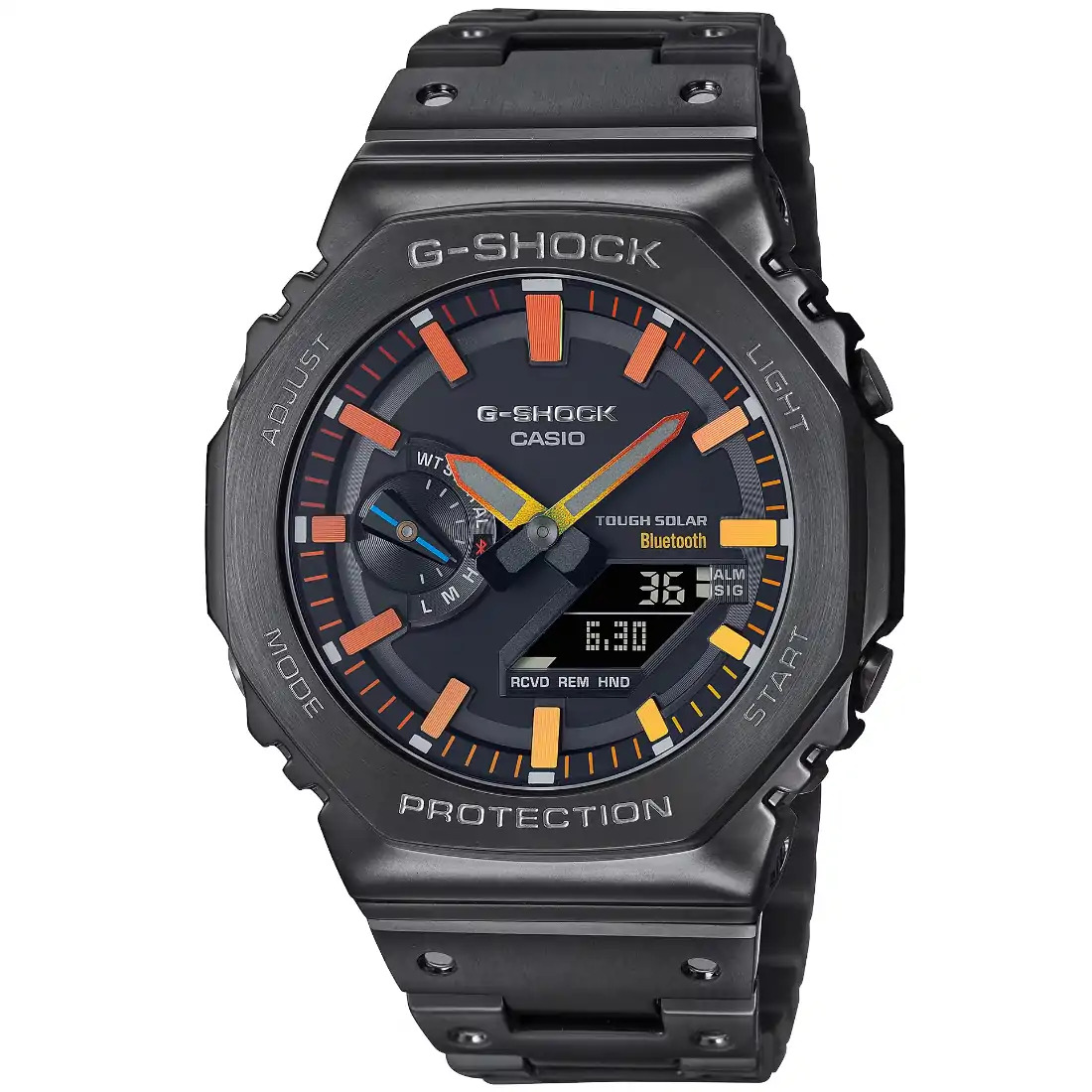 Tamaño de la caja (L× W× H): 49.8 × 44.4 × 12.8 mm Material de la caja/bisel: Acero inoxidable Peso: 165 g Correa de acero inoxidable Broche de una pulsación y triple pliegue Resistente a impactos Resistencia al agua de 200 m Fuente de alimentación: Tough Solar (con energía solar)