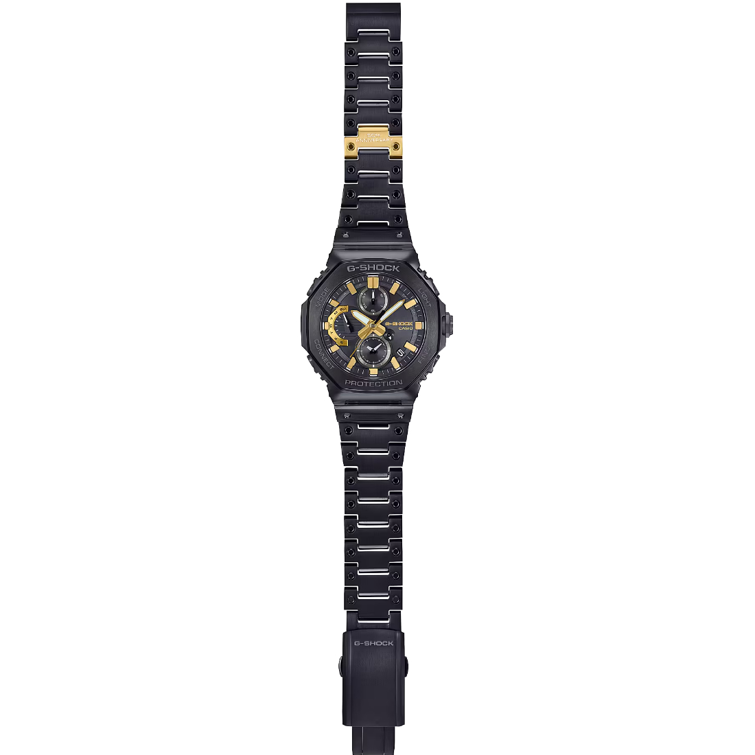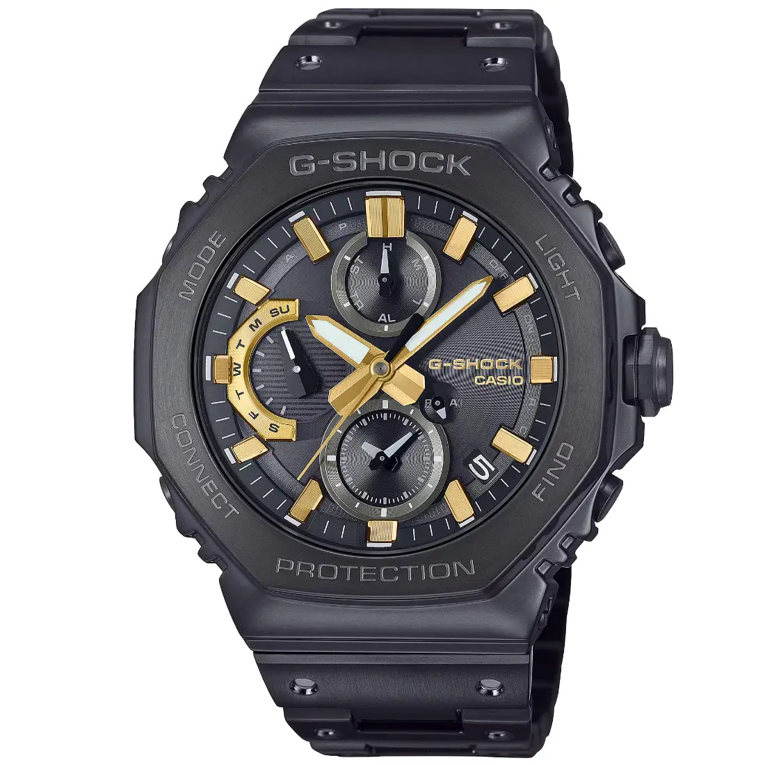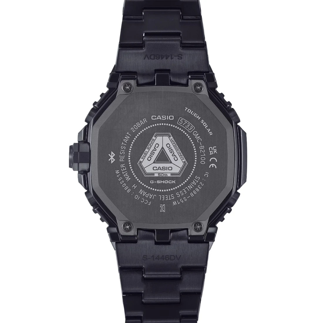 Tamaño de la caja (largo × ancho × alto): GMC-B2100ZE-1A Material de la caja/bisel: Acero inoxidable Peso: 171 g Correa de acero inoxidable Broche de una pulsación y triple pliegue Resistente a impactos Resistencia al agua de 200 m Bluetooth: Se conecta a un teléfono inteligente y ajusta automáticamente la hora Fuente de alimentación: Tough Solar (con energía solar)