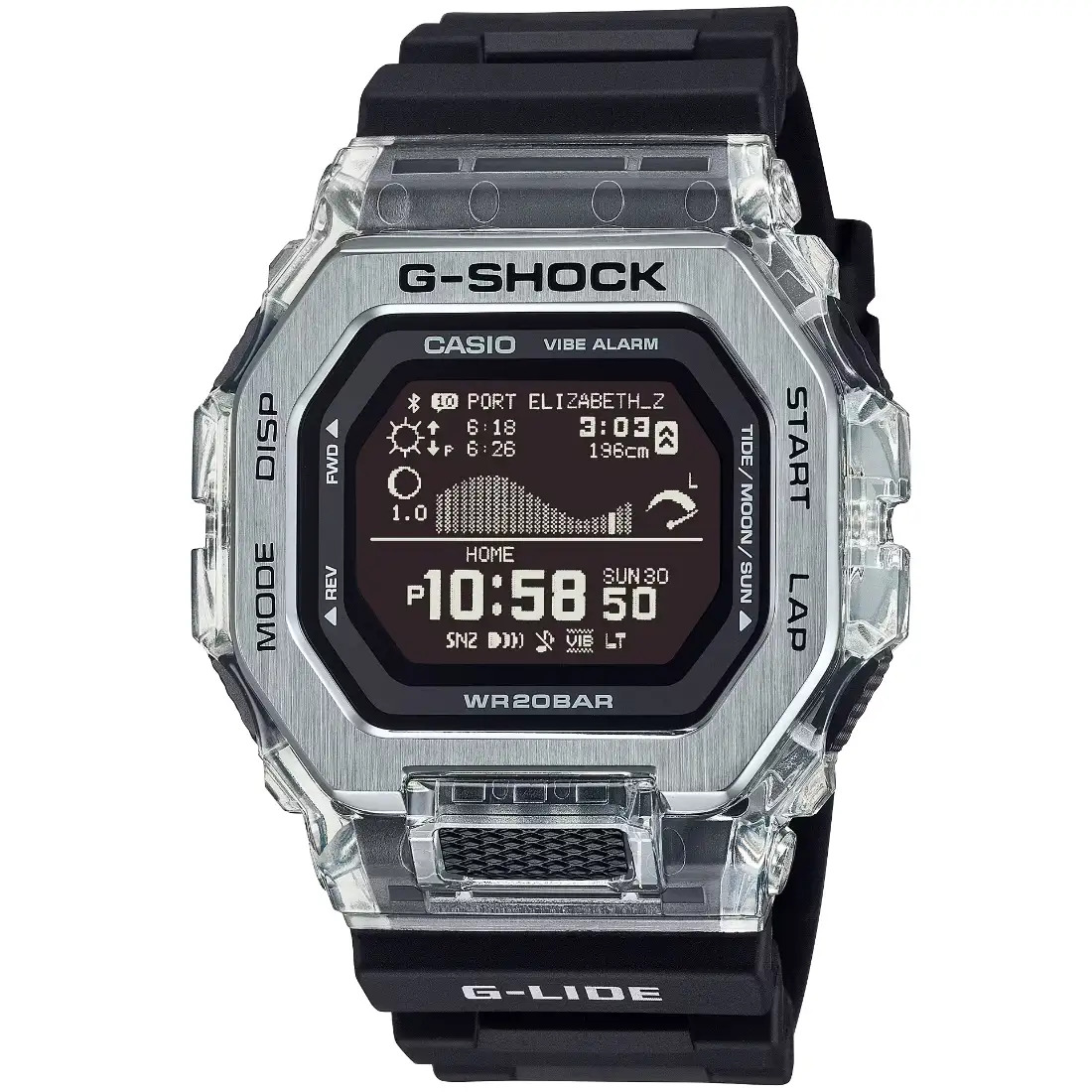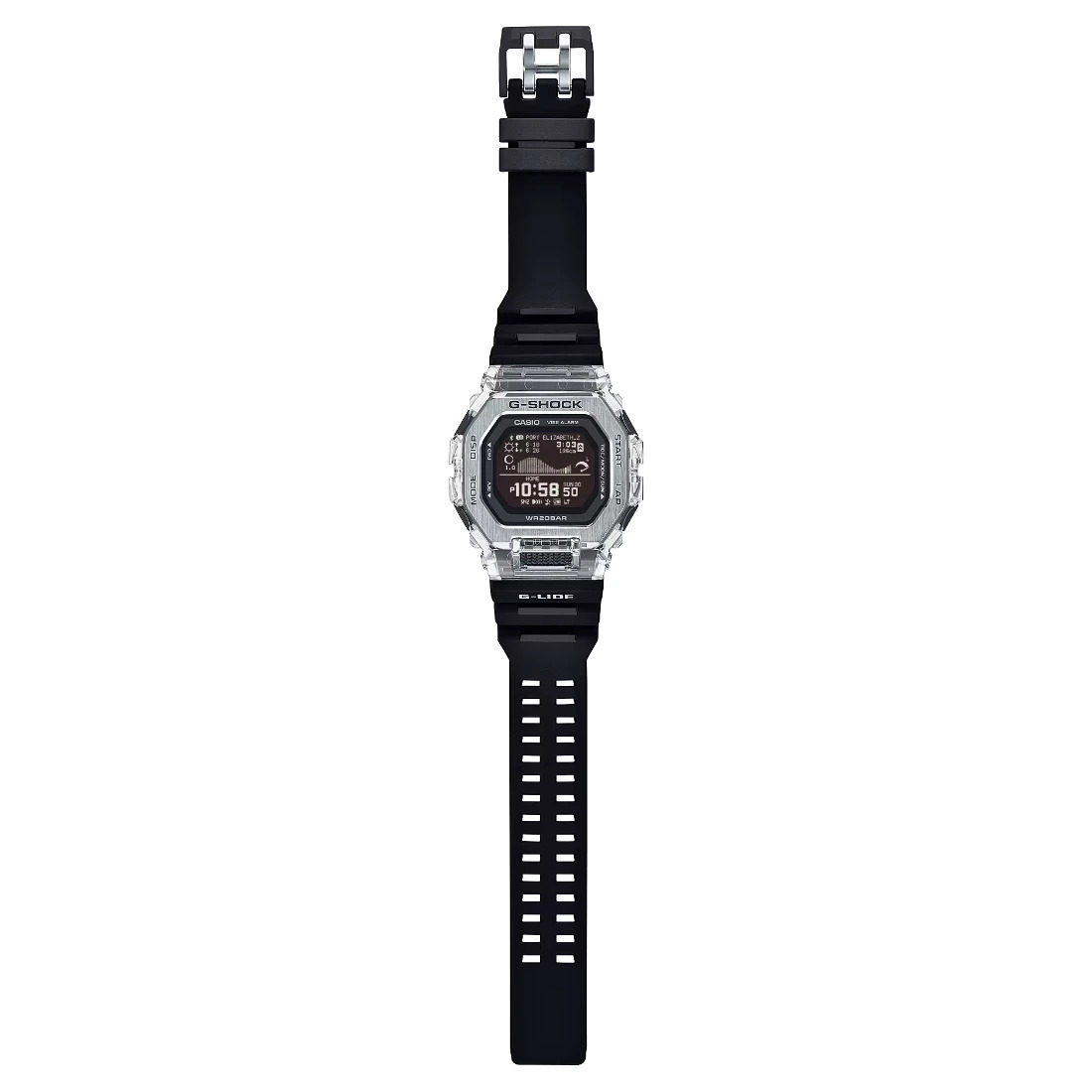 Hora mundial 38 zonas horarias Datos lunares (fases de la luna de la fecha específica, fases de la luna) Gráfico de mareas (nivel de marea para una fecha y hora específicas) Visualización de salida y puesta del sol Cronómetro Temporizador con cuenta regresiva 4 alarmas diarias con función de despertador Luz de fondo LED (Super Illuminator) Blanco Calendario automático completo (hasta el año 2099) Función de silencio Función de ahorro de energía Precisión: ±15 segundos por mes (sin la función Mobile Link) Formato de 12 y 24 horas Modo avión Regular timekeeping: Hour, minute, second, am/pm, month, date, day Creación del perfil del usuario Vibración activada/desactivada Vibrador Datos de Life Log Visualización diaria de datos (conteo de pasos), Visualización mensual de datos (distancia de carrera) Datos de entrenamiento (hasta 100 carreras, hasta 140 tiempos de vuelta por carrera) Tiempo transcurrido, distancia, ritmo, calorías quemadas