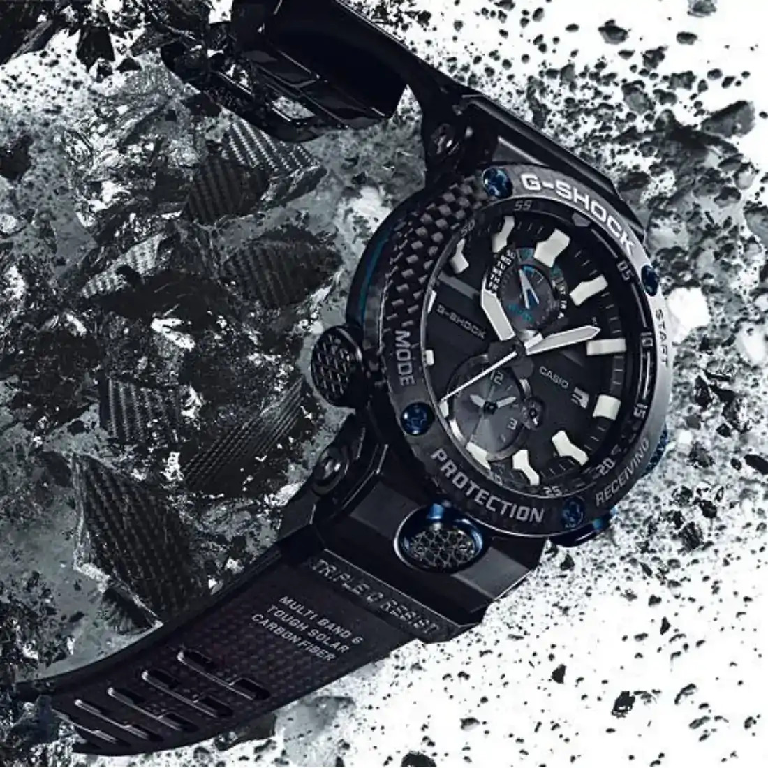 Tamaño de la caja (L× W× H): 46.2 × 46.3 × 16.9 mm Material de la caja/bisel: Carbono Peso: 72 g Correa de resina con fibra de carbono Resistente a impactos Resistente a la corrosión TRIPLE G RESIST (resistente a impactos, a la fuerza centrífuga y a las vibraciones) Estructura Carbon Core Guard Resistencia al agua de 200 m Reloj radio-controlado; Multibanda 6 Fuente de alimentación: Tough Solar (con energía solar)