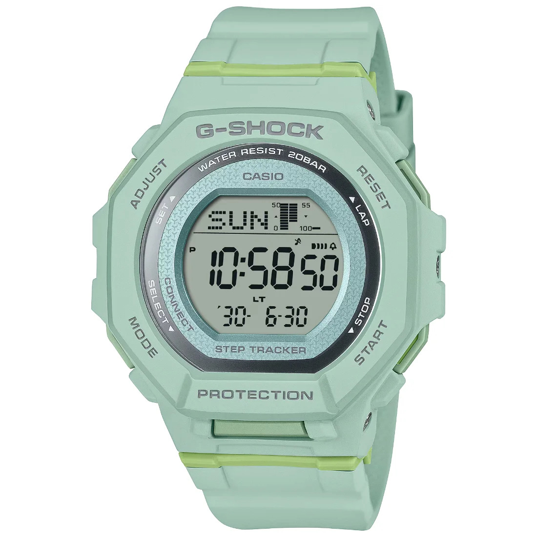 Tamaño de la caja (L× W× H): 46.4 × 43.8 × 12 mm Material de la caja/bisel: Resina/resina de base biológica Peso: 41 g Correa de resina de base biológica Resistente a impactos Resistencia al agua de 200 m Fuente de alimentación: pila Medición del conteo de pasos: Rango de visualización de conteo de pasos: de 0 a 999 999 pasos Visualización del progreso del objetivo de pasos (margen de configuración del objetivo de conteo de pasos: de 1000 a 50 000, aumentos de 1000 pasos) Gráfico de conteo de pasos (Conteo de pasos por hora para las últimas 7 horas en un gráfico de 6 niveles) Indicador de pasos
