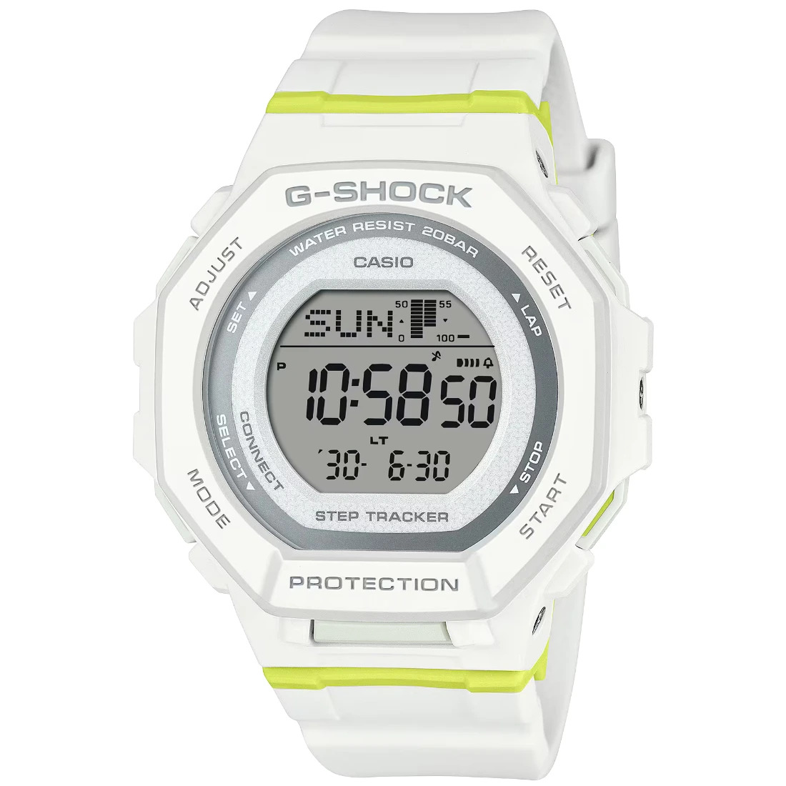 Tamaño de la caja (largo × ancho × alto): 46.4 × 43.8 × 12 mm Material de la caja/bisel: Resina/resina de base biológica Peso: 41 g Correa de resina de base biológica Resistente a impactos Bluetooth: Se conecta a un teléfono inteligente y ajusta automáticamente la hora. Resistencia al agua de 200 m Fuente de alimentación: pila Medición del conteo de pasos Rango de visualización de conteo de pasos Gráfico de conteo de pasos Indicador de pasos