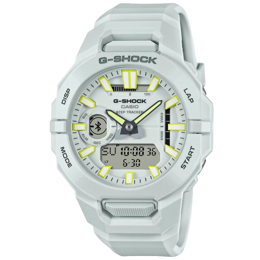 Tamaño de la caja (largo × ancho × alto): 48.5 × 43.9 × 16 mm Material de la caja/bisel: Resina/resina de base biológica Peso: 53 g Correa de resina de base biológica Resistente a impactos Resistencia al agua de 200 m Bluetooth: Se conecta a un teléfono inteligente y ajusta automáticamente la hora. Fuente de alimentación: pila Función de medición Lifelog (cálculos de calorías y distancia basados en conteo de pasos), incluida la tasa metabólica basal Visualización de datos diarios: Conteo de pasos, calorías, distancia