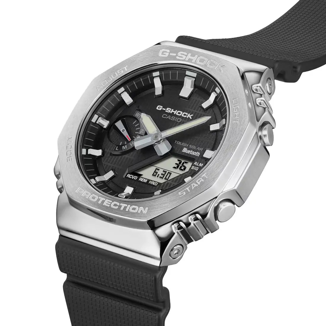 Hora mundial 38 zonas horarias Cronómetro Temporizador con cuenta regresiva 5 alarmas diarias Señal de hora Luz LED doble Blanco Calendario automático completo (hasta el año 2099) Función de silencio Función de ahorro de energía Indicador de nivel de carga de la batería Precisión: ±15 segundos por mes (sin la función Mobile Link) Función de movimiento de agujas (las agujas se apartan para proporcionar una visión sin obstrucciones del contenido digital de la pantalla). Formato de 12 y 24 horas Cambio de visualización de fecha/mes Visualización del día (días de la semana seleccionables en seis idiomas) Funciones clásicas de reloj: Analógica: 2 manecillas (hora, minuto [la manecilla se mueve cada 20 segundos]), 1 dial (nivel de carga de la batería, modo) Digital: horas, minutos, segundos, p. m., mes, fecha, día