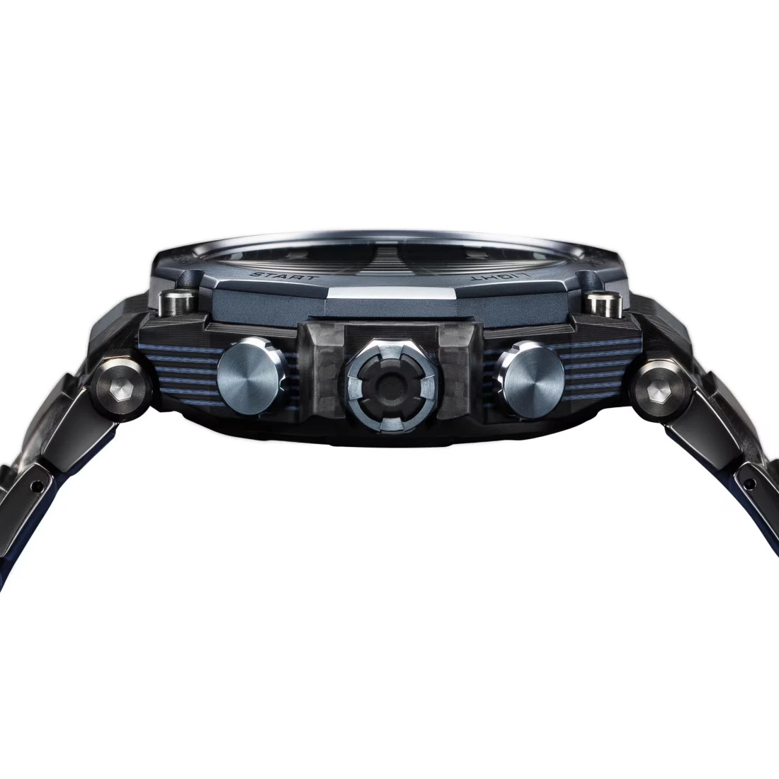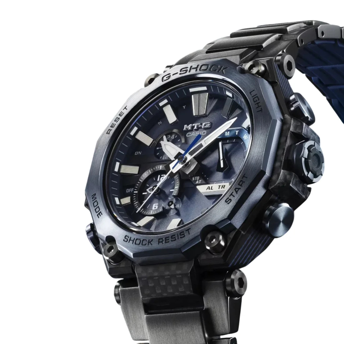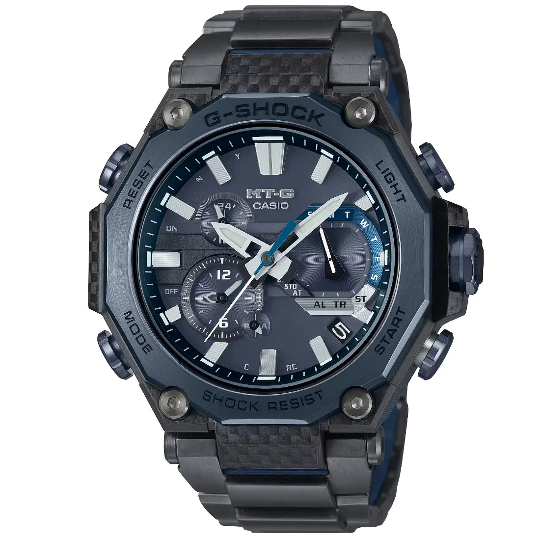 Tamaño de la caja (largo × ancho × alto): 55.1 × 49.8 × 15.9 mm Material de la caja/bisel: Carbono/acero inoxidable Peso: 131 g Correa estratificada compuesta Broche de una pulsación y triple pliegue TRIPLE G RESIST (resistente a impactos, a la fuerza centrífuga y a las vibraciones) Estructura Carbon Core Guard Resistencia al agua de 200 m Bluetooth: Se conecta a un teléfono inteligente y ajusta automáticamente la hora. Reloj radio-controlado; Multiband 6 Fuente de alimentación: Tough Solar (con energía solar)