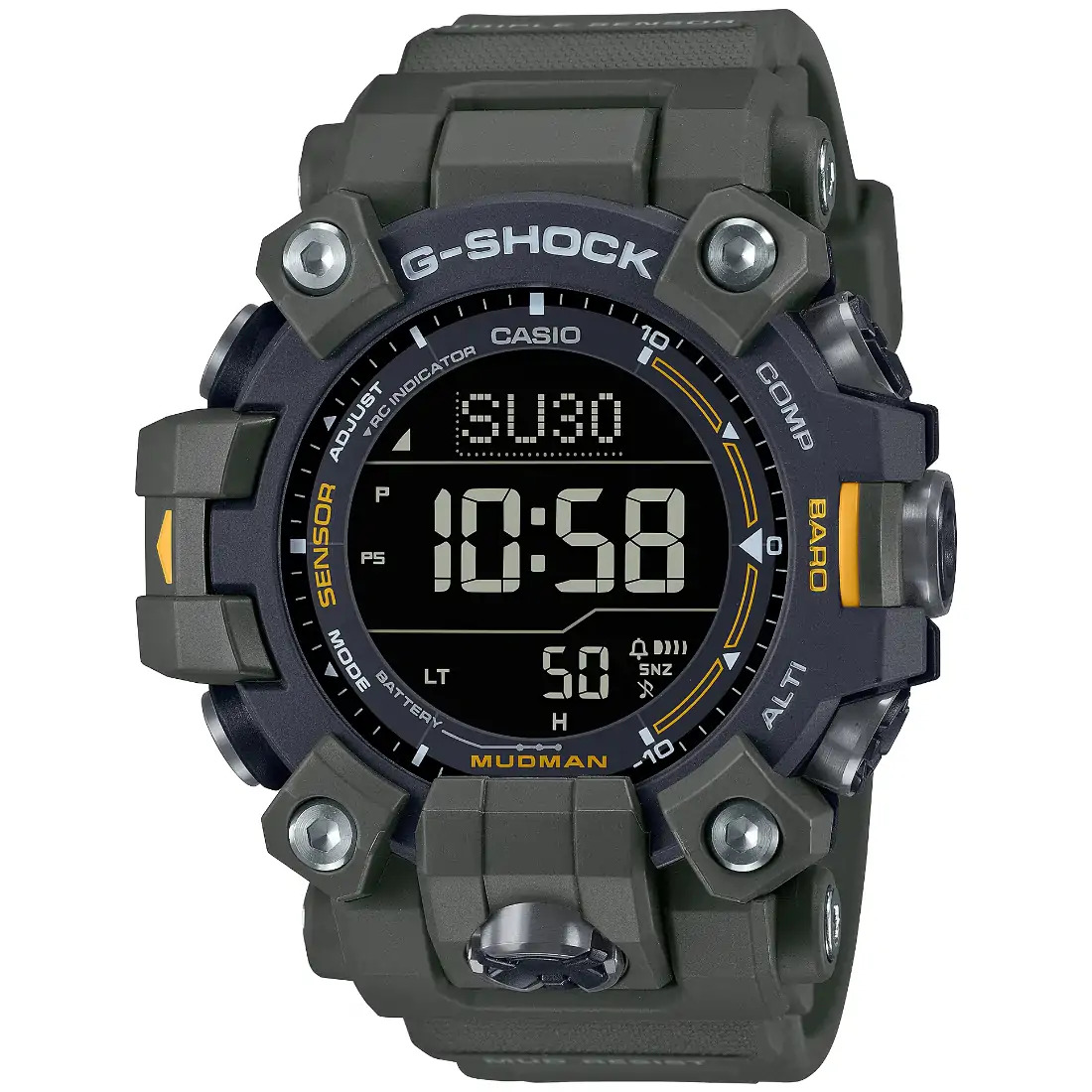 Tamaño de la caja (largo × ancho × alto): 56.7 × 52.7 × 14.8 mm Peso: 81 g Material de la caja y el bisel: Resina de base biológica Correa de resina de base biológica Resistente a impactos Resistente al barro Estructura Carbon Core Guard Reloj radio-controlado; Multiband 6 Resistencia al agua de 200 m Fuente de alimentación: Tough Solar (con energía solar) Brújula digital Altímetro Barómetro Termómetro