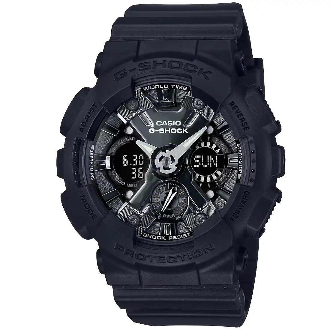 Hora mundial para 29 zonas horarias Cronómetro Temporizador con cuenta regresiva 5 alarmas diarias (1 alarma con función de despertador) Señal de hora Luz LED Encendido automático de luz Calendario automático completo (hasta el año 2099) Función de silencio Precisión: ±15 segundos por mes Formato de 12 y 24 horas Funciones clásicas de reloj: Analógica: 2 manecillas (hora, minuto [la manecilla se mueve cada 20 segundos]), 1 dial (velocidad) Digital: horas, minutos, segundos, p. m., mes, fecha, día