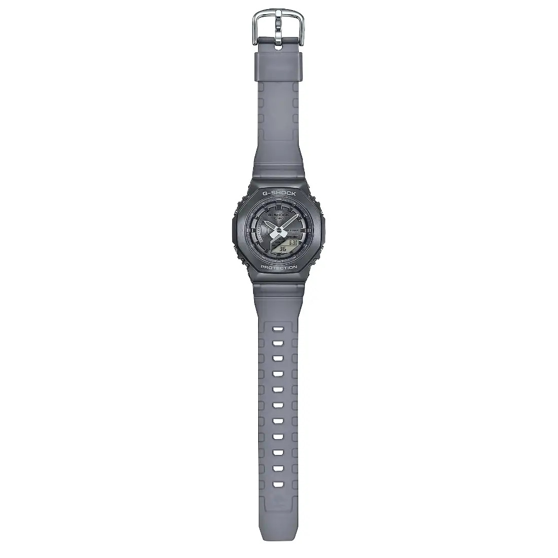 Tamaño de la caja (L× W× H): 45.9 × 40.4 × 11 mm Material de la caja/bisel: Resina/acero inoxidable Peso: 55 g Correa de resina Resistente a impactos Resistencia al agua de 200 m Fuente de alimentación: pila