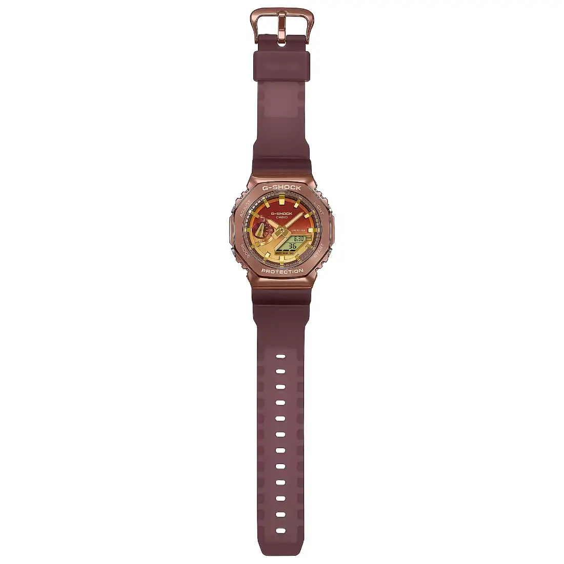 Tamaño de la caja (largo × ancho × alto): 49.3 × 44.4 × 11.8 mm Peso: 72 g Material de la caja y el bisel: Resina/acero inoxidable Correa de resina Resistente a impactos Resistencia al agua de 200 m Fuente de alimentación: Pila