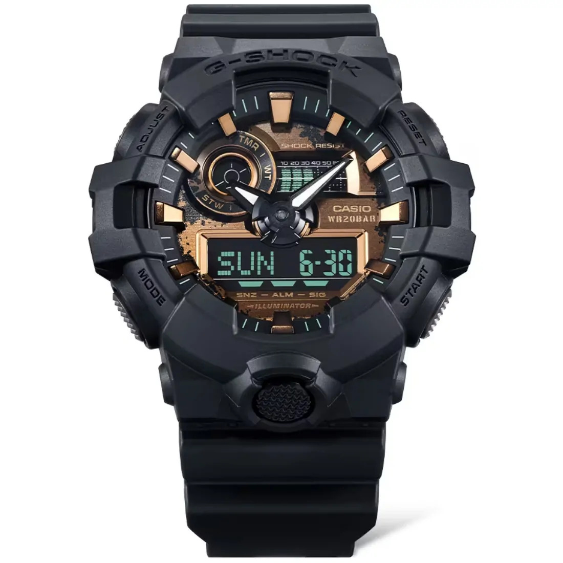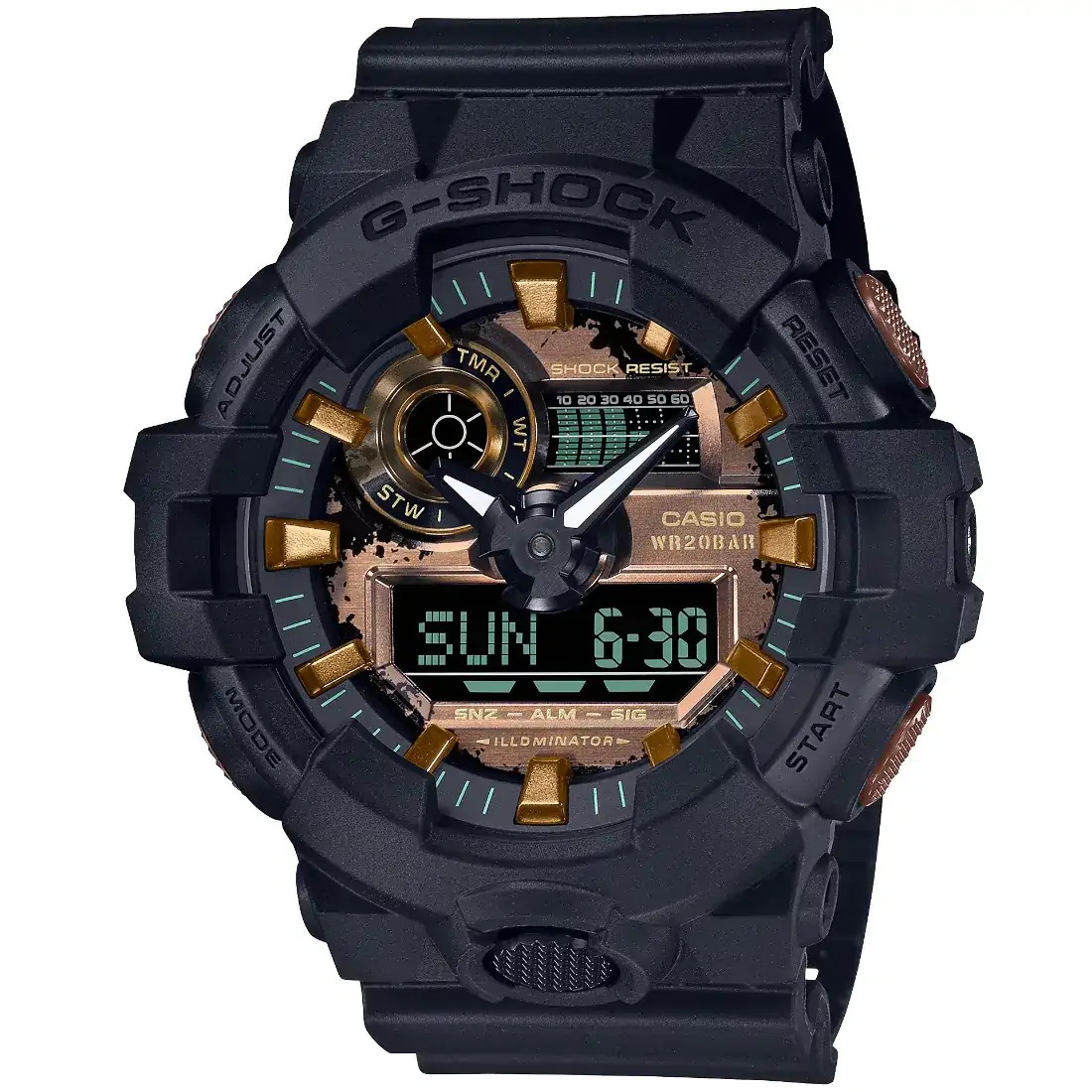 Tamaño de la caja (L× W× H): 57.5 × 53.4 × 18.5 mm Material de la caja/bisel: Resina Peso: 69 g Correa de resina Resistente a impactos Resistencia al agua de 200 m Fuente de alimentación: pila