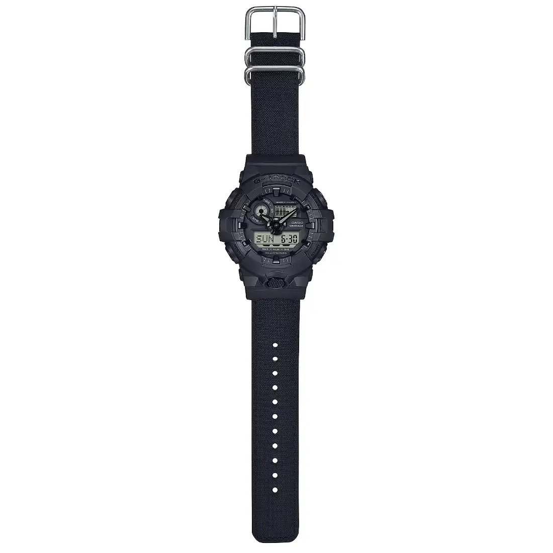 Tamaño de la caja (L× W× H): 57.5 × 53.4 × 18.5 mm Material de la caja/bisel: Resina Peso: 76 g Correa de tela (tela ecológica CORDURA®) Resistente a impactos Resistencia al agua de 200 m Fuente de alimentación: pila