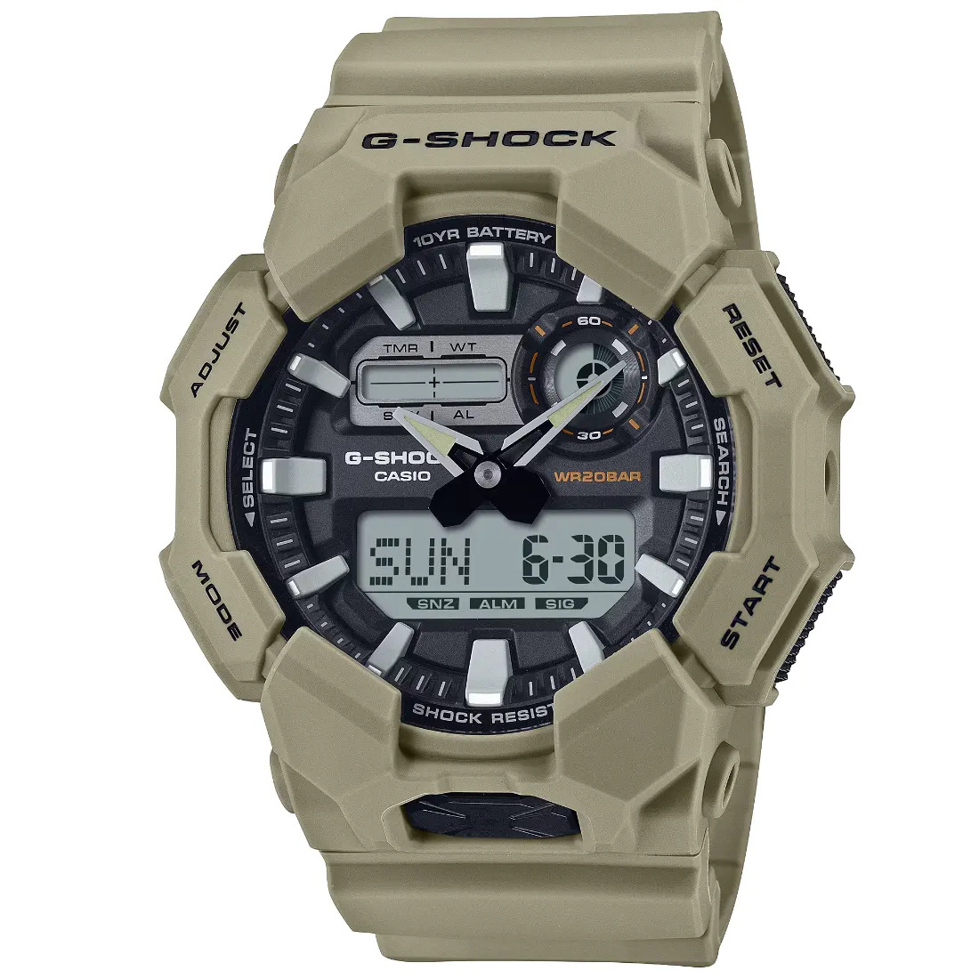 Tamaño de la caja (L× W× H): 55.1 × 51.9 × 17.5 mm Material de la caja/bisel: Carbono de origen biológico/resina de origen biológico Peso: 67 g Correa de resina de base biológica Resistente a impactos Estructura Carbon Core Guard Resistencia al agua de 200 m Fuente de alimentación: pila