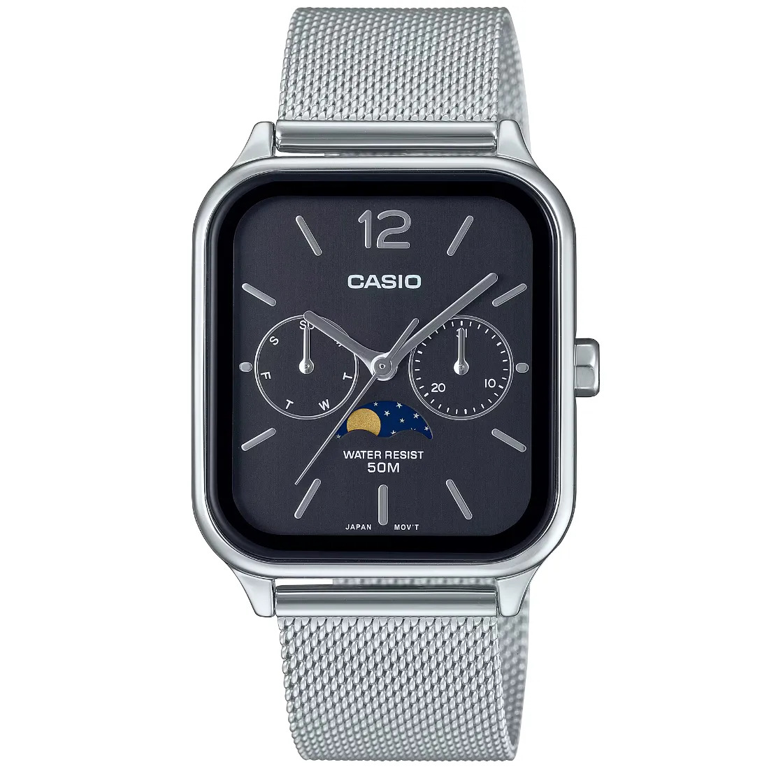 Tamaño de la caja (largo × ancho × alto): 44.5 × 34 × 9.4 mm Material de la caja/bisel: Acero inoxidable Peso: 80 g Correa de Malla de Acero Inoxidable Broche ajustable Resistencia al agua de 50 m Fuente de alimentación: pila