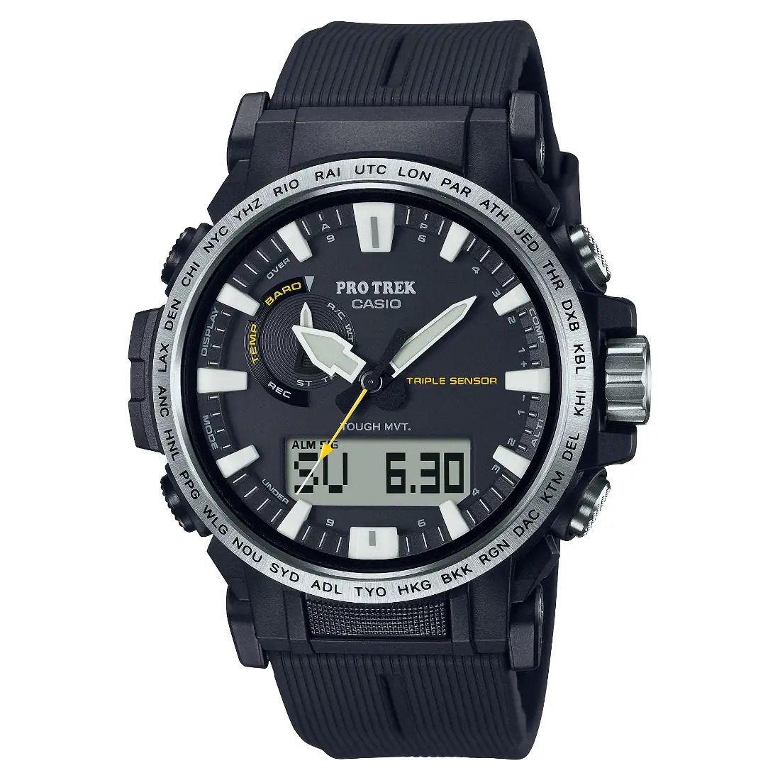 Hora mundial para 29 zonas Cronómetro Temporizador con cuenta regresiva 5 alarmas diarias Señal de hora Luz LED doble Función de silencio Corrección automática de la posición inicial de la aguja Función de ahorro de energía Indicador de carga de pila Precisión: ±15 segundos por mes (sin señal de calibración) Característica de cambio de las agujas (manual o automático (durante la medición de la presión barométrica, la altitud y la temperatura)) Funciones clásicas de reloj: Analógica: 3 manecillas (hora, minuto [la manecilla se mueve cada 10 segundos], segundo) Digital: horas, minutos, segundos, a. m./p. m., mes, fecha, día Recepción de señal de calibración de hora Recepción automática hasta seis* veces al día (las recepciones automáticas restantes se cancelan en cuanto tiene lugar una recepción exitosa) * 5 veces al día para la señal de calibración china Recepción manual Resultados de última recepción de señal