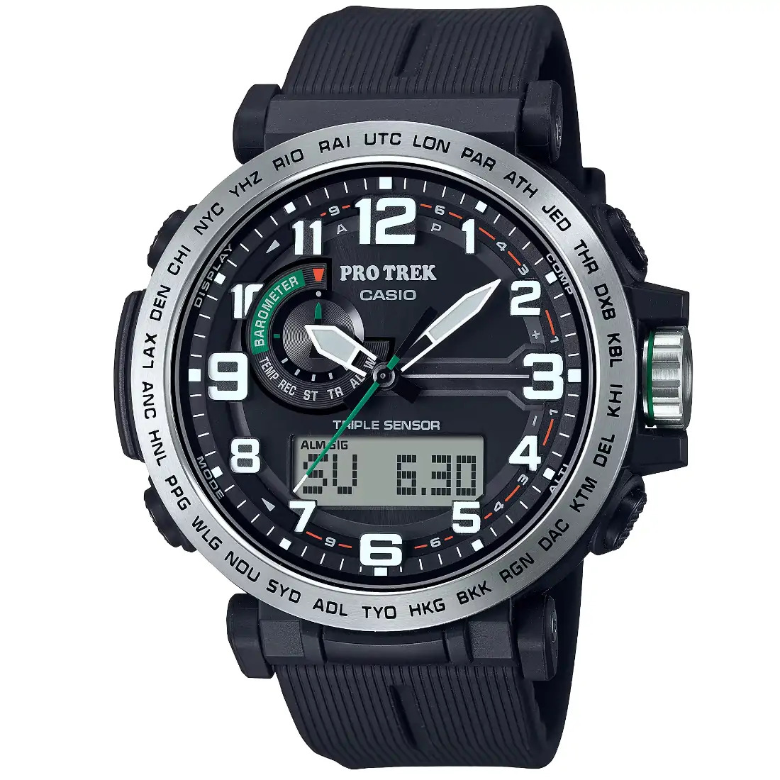 Características del reloj Hora mundial, 29 zonas horarias Cronómetro Temporizador con cuenta regresiva 5 alarmas diarias Señal de hora Luz LED doble Calendario automático completo (hasta el año 2099) Función de silencio Función de ahorro de energía Indicador de carga de pila Precisión: ±15 segundos por mes Formato de 12 y 24 horas Característica de cambio de las agujas (manual o automático (durante la medición de la presión barométrica, la altitud y la temperatura)) Funciones clásicas de reloj: Analógica: 3 manecillas (hora, minuto [la manecilla se mueve cada 10 segundos], segundo) Digital: Hora, minuto, segundo, a. m./p. m., fecha, día