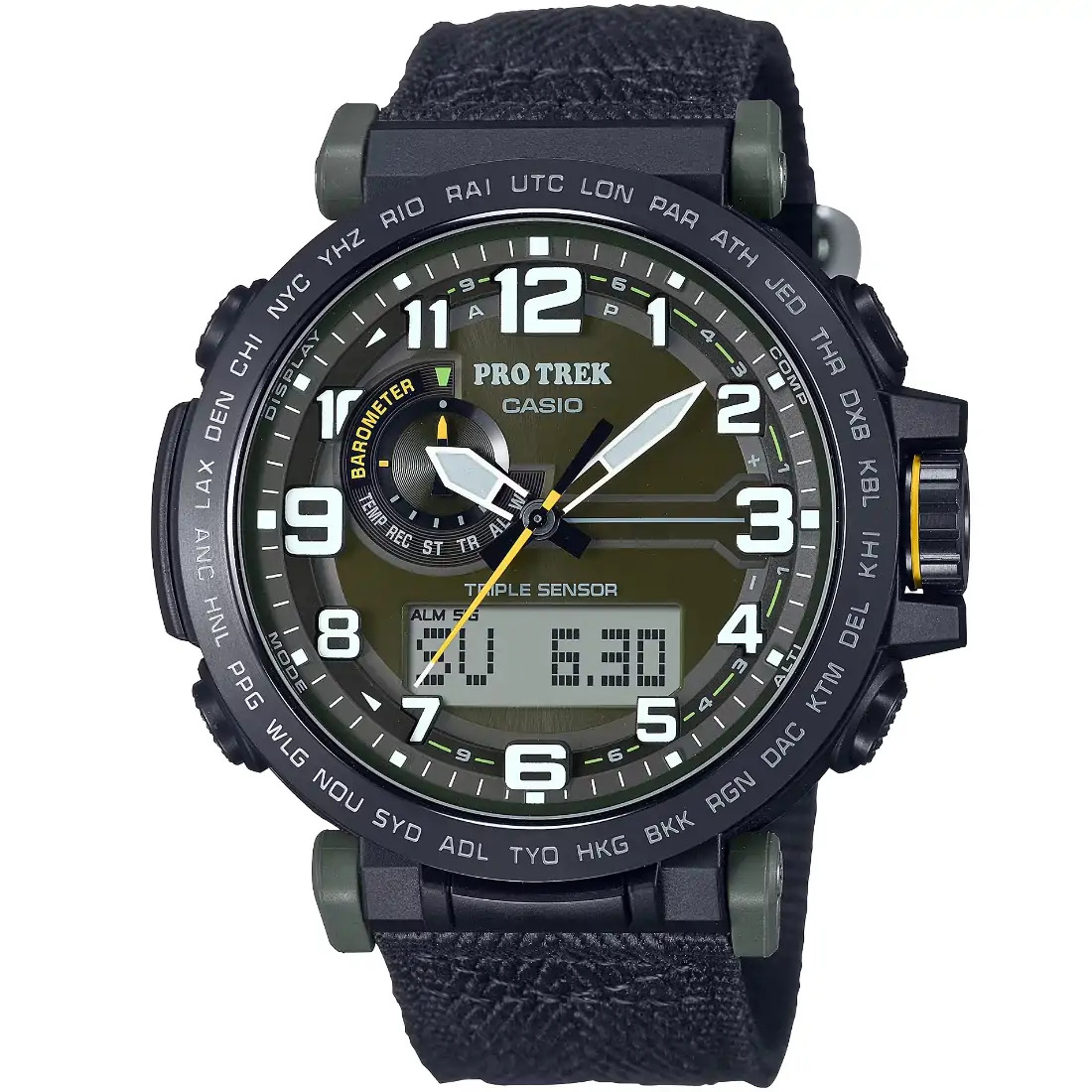 Características del reloj Hora mundial, 29 zonas horarias Cronómetro Temporizador con cuenta regresiva 5 alarmas diarias Señal de hora Luz LED doble Calendario automático completo (hasta el año 2099) Función de silencio Función de ahorro de energía Indicador de carga de pila Precisión: ±15 segundos por mes Formato de 12 y 24 horas Característica de cambio de las agujas (manual o automático (durante la medición de la presión barométrica, la altitud y la temperatura)) Funciones clásicas de reloj: Analógica: 3 manecillas (hora, minuto [la manecilla se mueve cada 10 segundos], segundo) Digital: Hora, minuto, segundo, a. m./p. m., fecha, día