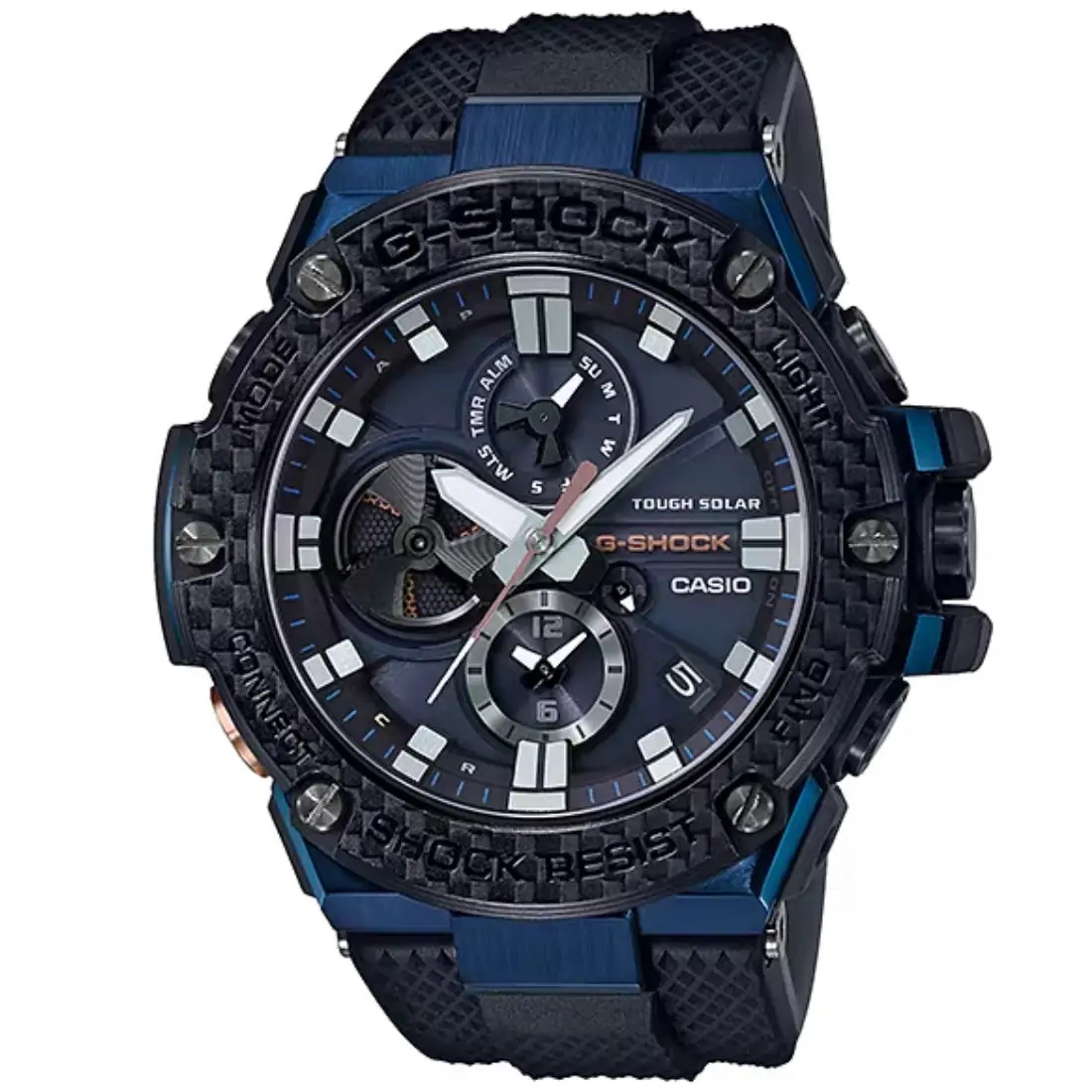 Tamaño de la caja (L× W× H): 58.1 × 53.8 × 14.1 mm Material de la caja/bisel: Resina/acero inoxidable, carbono Peso: 104 g Correa de resina Resistente a impactos Resistencia al agua de 200 m Fuente de alimentación: Tough Solar (con energía solar)