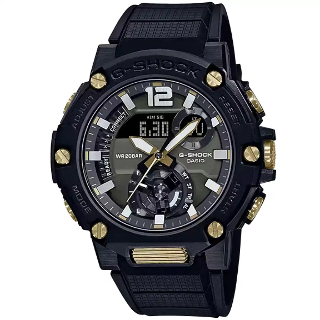 Tamaño de la caja (L× W× H): 51 × 50.3 × 15.3 mm Material de la caja/bisel: Resina/acero inoxidable Peso: 82 g Correa de resina Resistente a impactos Resistencia al agua de 200 m Fuente de alimentación: Tough Solar (con energía solar)
