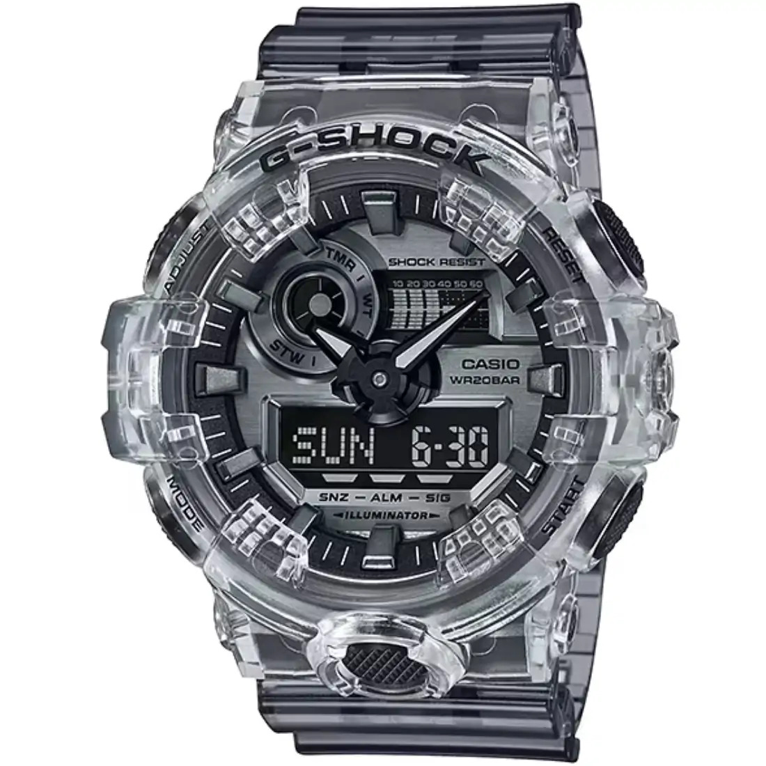 Tamaño de la caja (L× W× H): 57.5 × 53.4 × 18.4 mm Material de la caja/bisel: Resina Peso: 69 g Correa de resina Resistente a impactos Resistencia al agua de 200 m Fuente de alimentación: pila