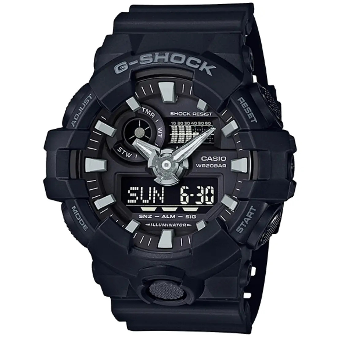 Hora mundial para 31 zonas horarias Cronómetro Temporizador con cuenta regresiva 5 alarmas diarias (1 alarma con función de despertador) Señal de hora Luz LED (Super Illuminator) Calendario automático completo (hasta el año 2099) Función de silencio Precisión: ±15 segundos por mes Formato de 12 y 24 horas Función de movimiento de agujas (las agujas se apartan para proporcionar una visión sin obstrucciones del contenido digital de la pantalla). Funciones clásicas de reloj: Analógica: 2 manecillas (hora, minuto [la manecilla se mueve cada 20 segundos]) Digital: horas, minutos, segundos, p. m., mes, fecha, día